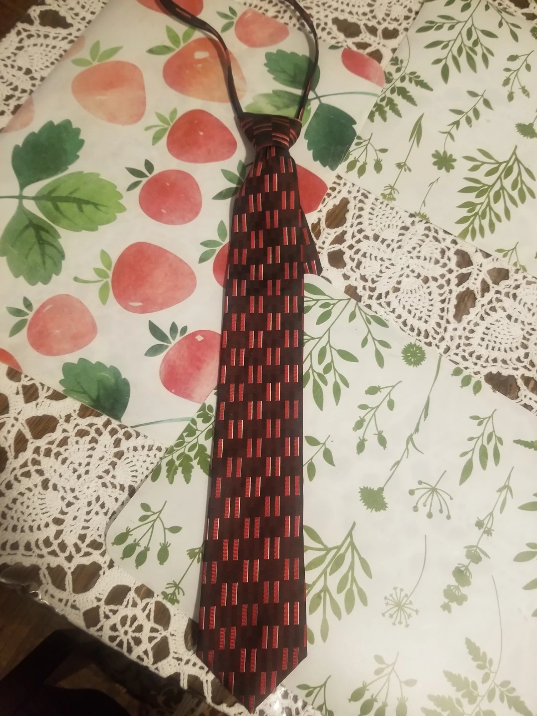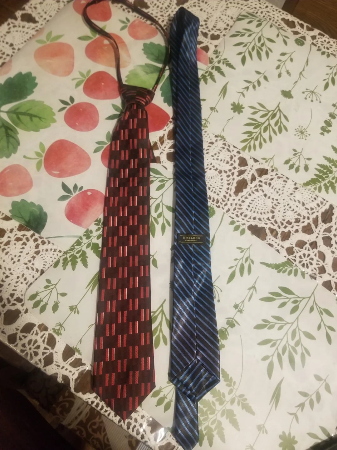 A red tie with a repeating rectangular pattern and a blue tie with stripes. One tie has a KAILONG label. Both are standard neckties. COMPLETELY FREE! Just Don't need them anymore