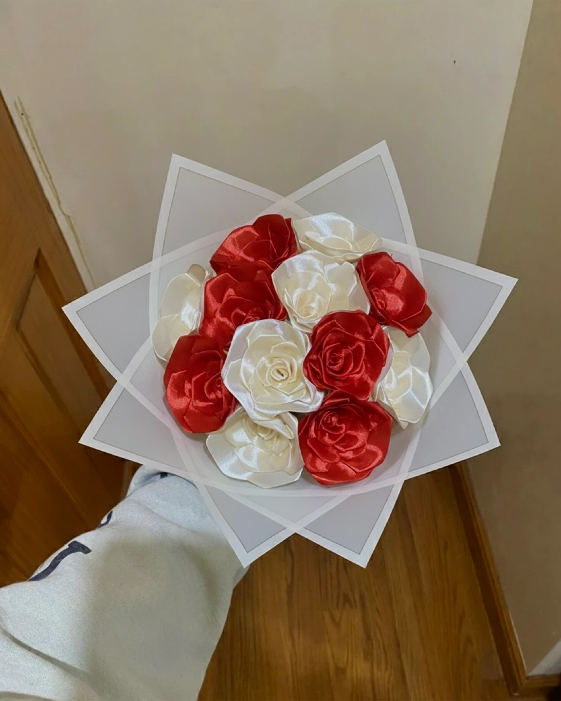 A lovely bouquet made with faux roses in red and cream satin. These artificial flowers are arranged in a decorative paper wrap. It's a charming decoration that won't wilt!