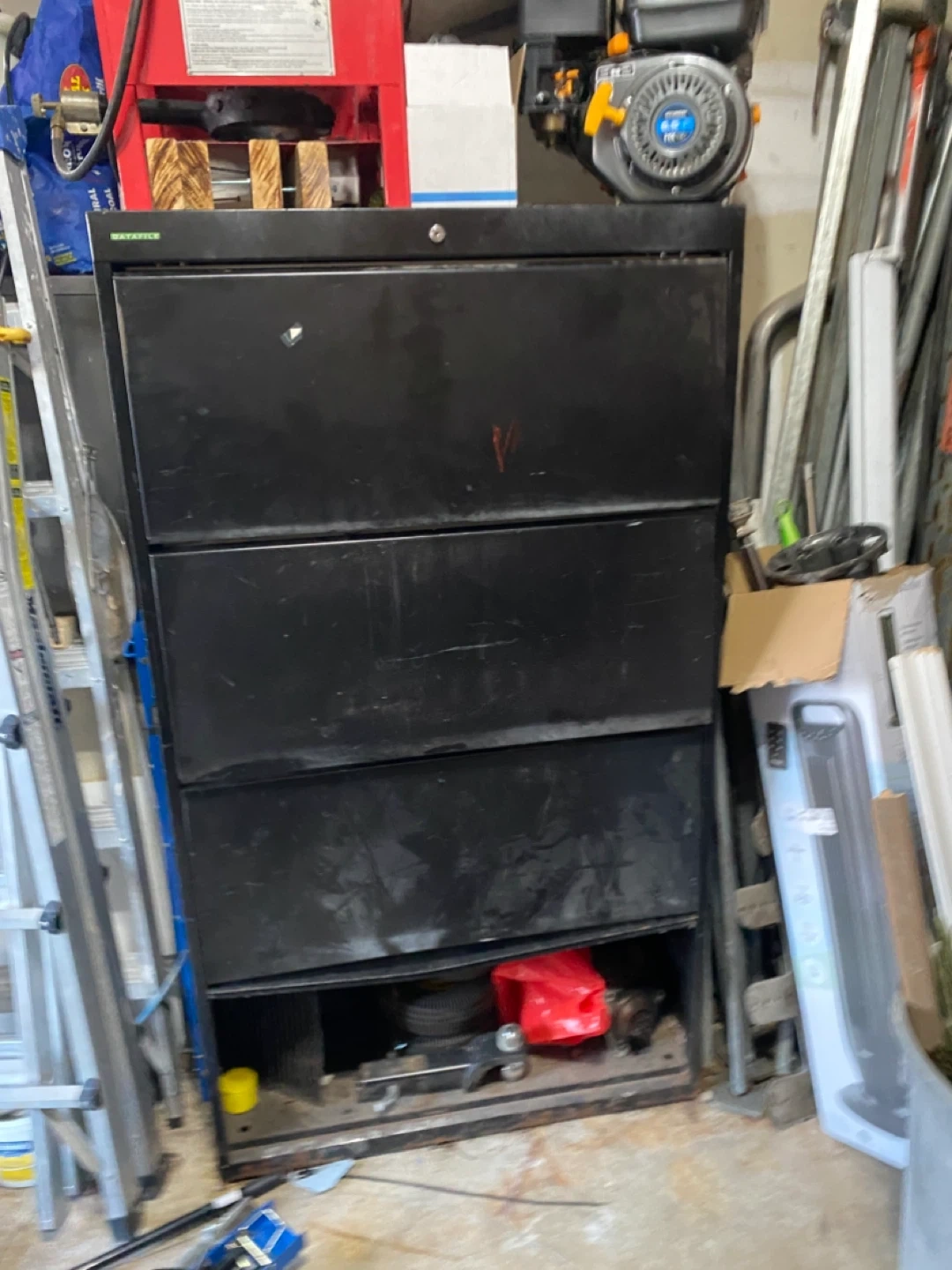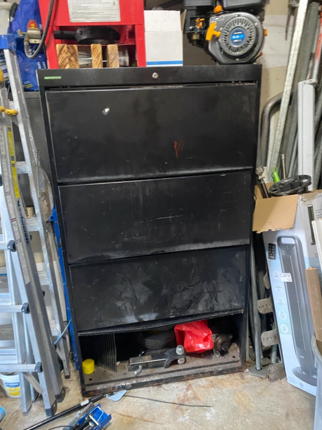 This is a storage cabinet. It has multiple drawers for storage. It's great for organizing your garage or space.