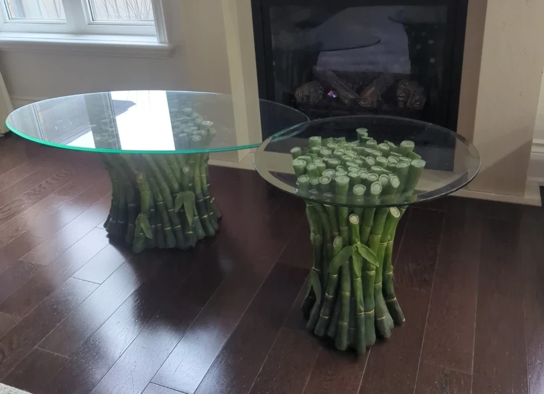 Two unique accent tables with glass tops and bases made of faux bamboo. These tables add a natural, stylish touch to any room. They're perfect for holding drinks, books, or decorative items.