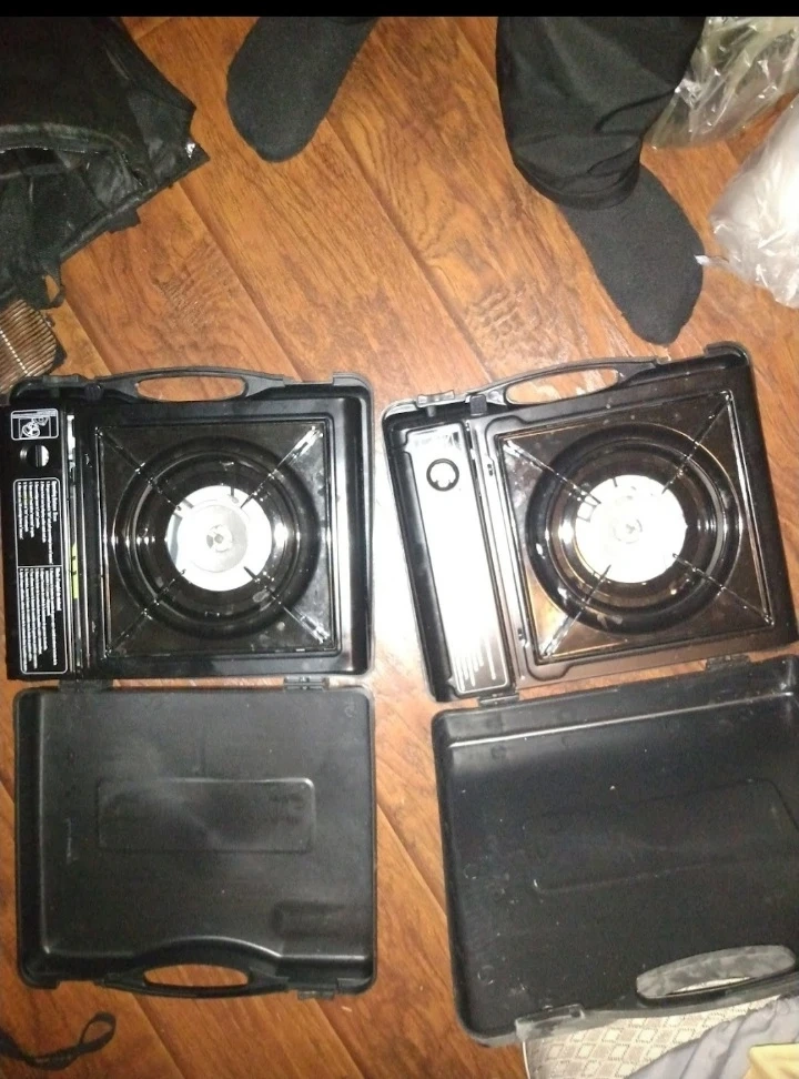 These are portable propane gas stove burners, perfect for camping or outdoor cooking. It comes in a durable black carrying case for easy transport. The unit is compact and designed for single-burner use, making it convenient for cooking tasks.