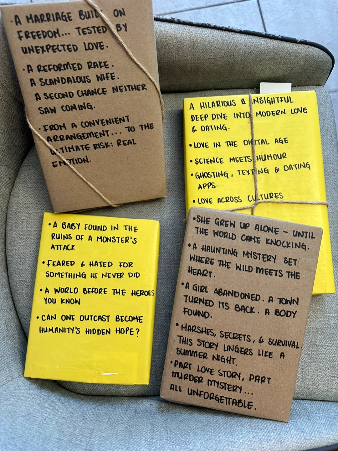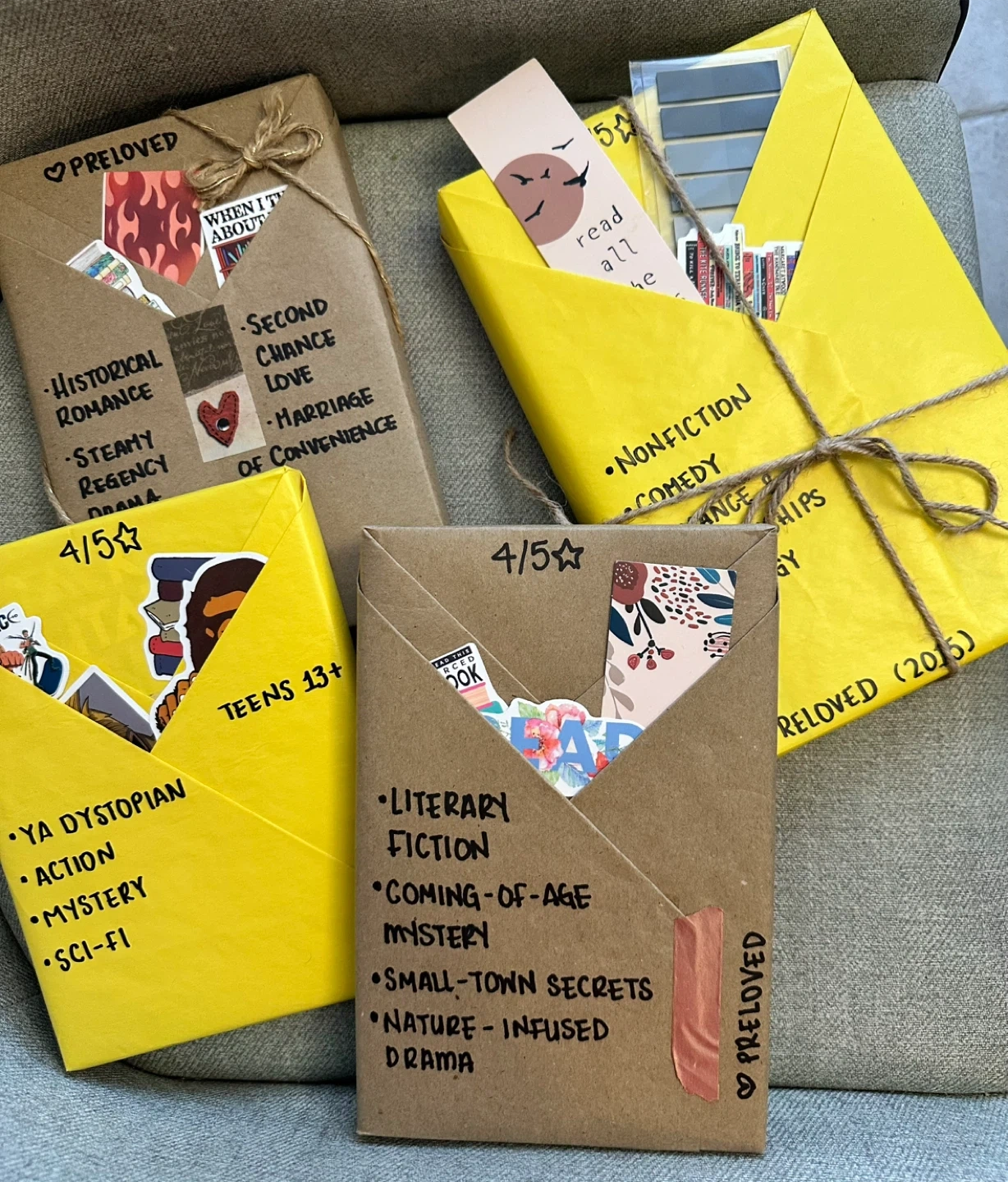 Four surprise books, each wrapped and ready to read! Genres include romance, mystery, dystopian, and non-fiction. Perfect for book lovers looking for a new adventure.