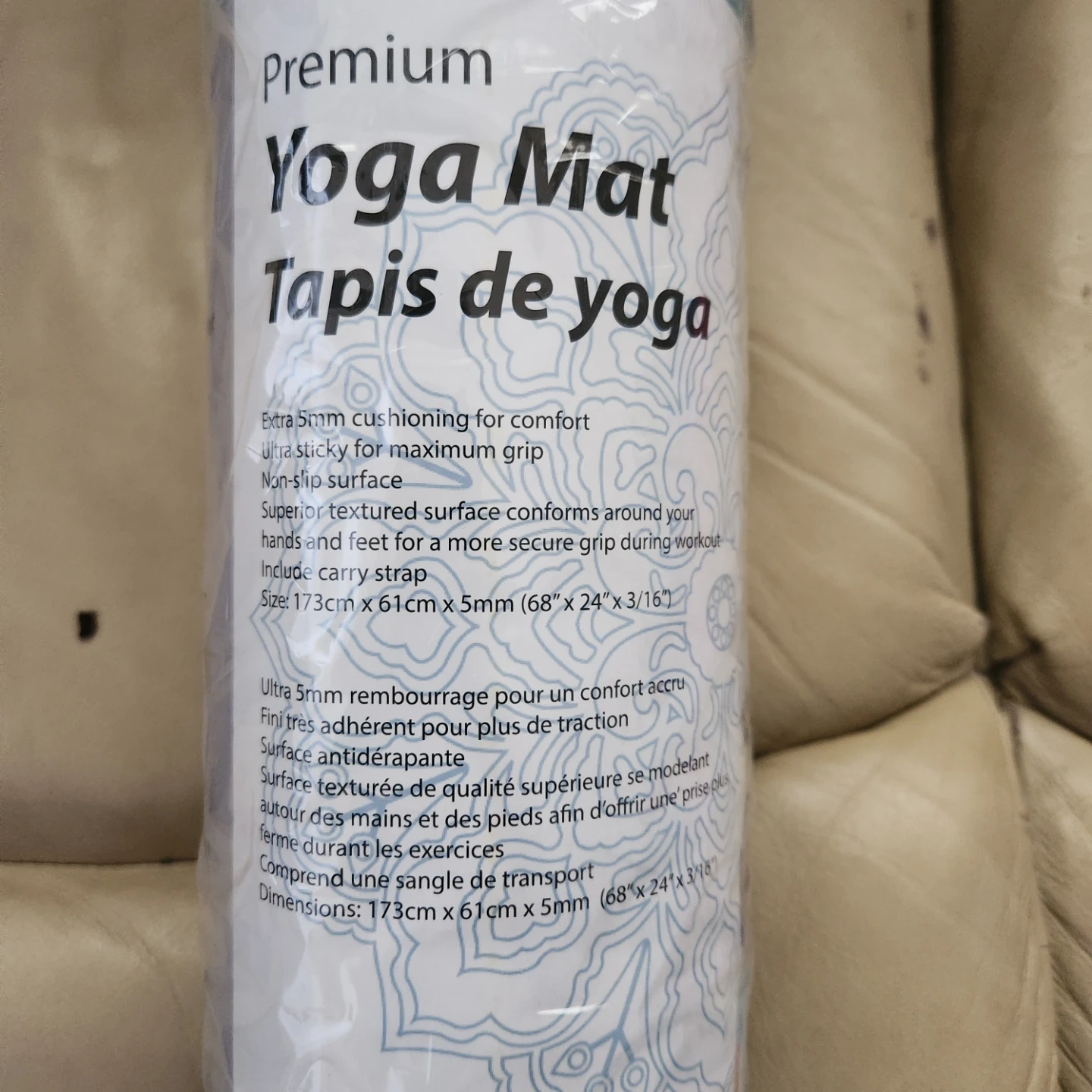 This premium yoga mat offers extra 5mm cushioning for comfort and a non-slip surface for maximum grip. It includes a carry strap for easy transport. Dimensions: 173cm x 61cm x 5mm.