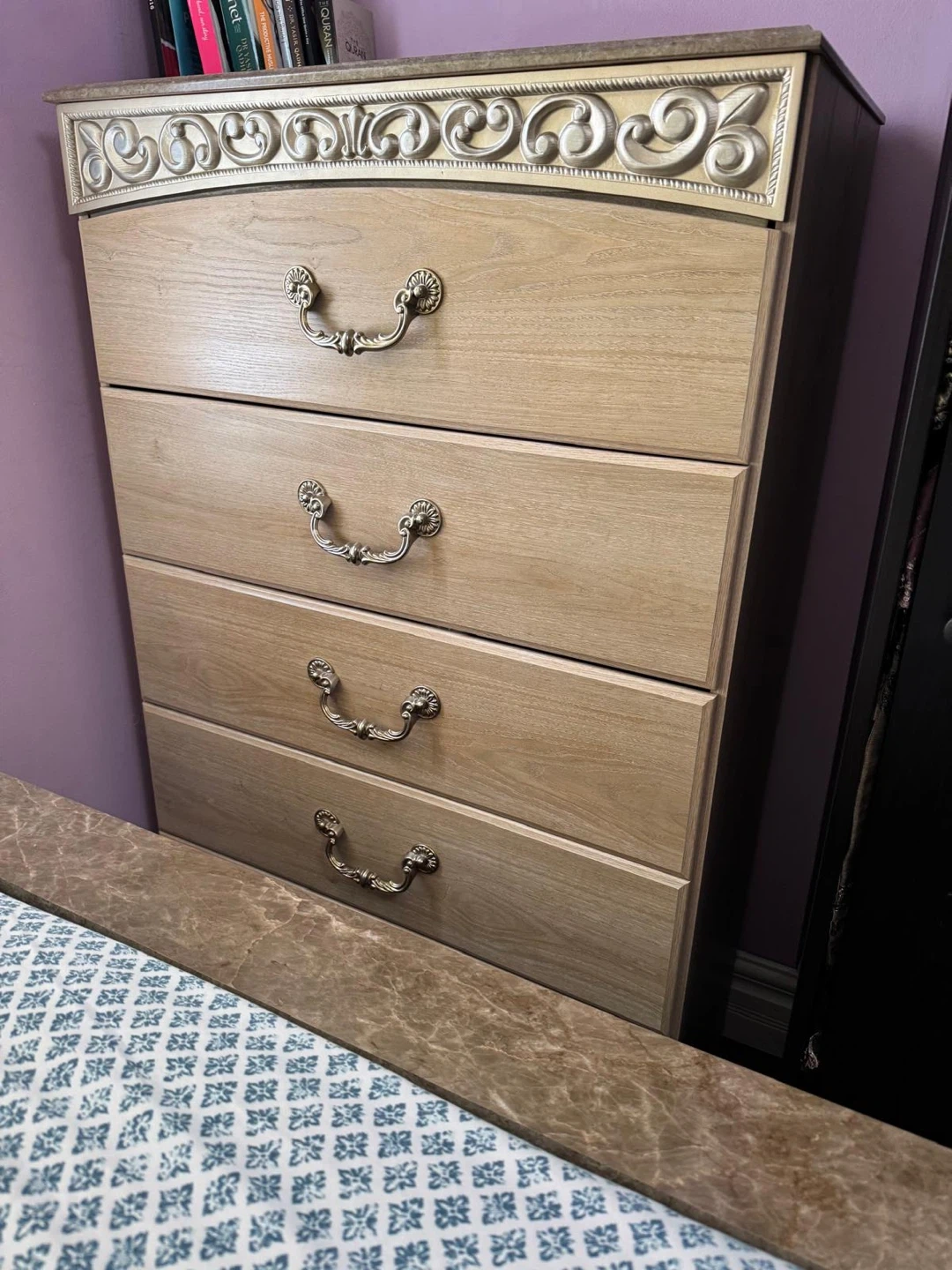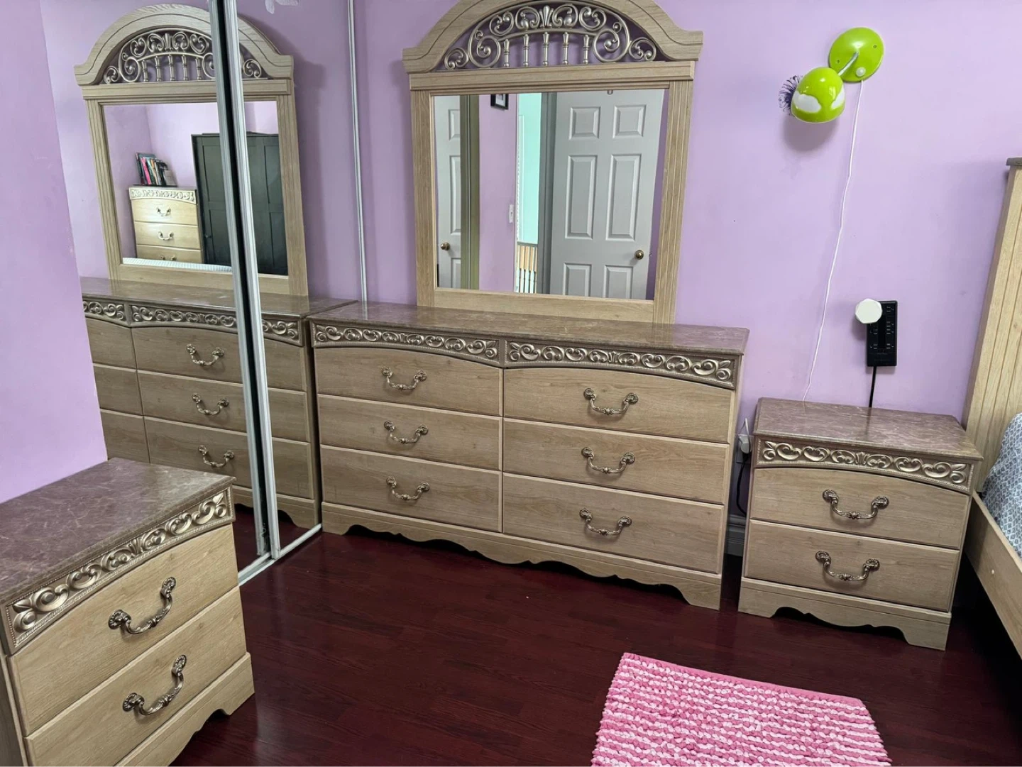 Queen size Wood bedroom set includes a dresser with six drawers, a matching nightstand with two drawers, and a bed frame. Also comes with an arched mirror. Some pieces have marble-look. Set is in a very good condition .This set is a great way to furnish a bedroom!