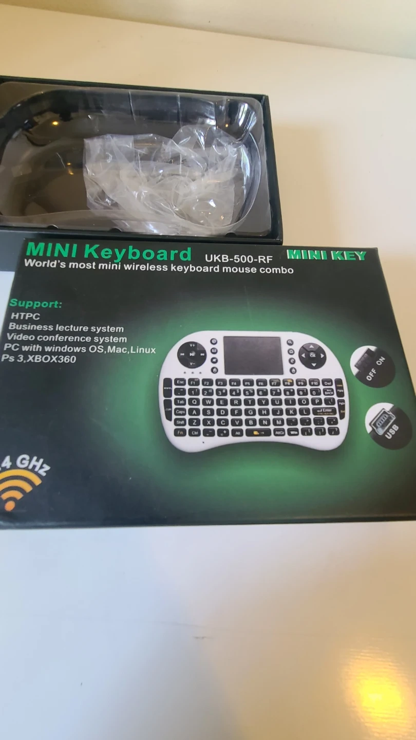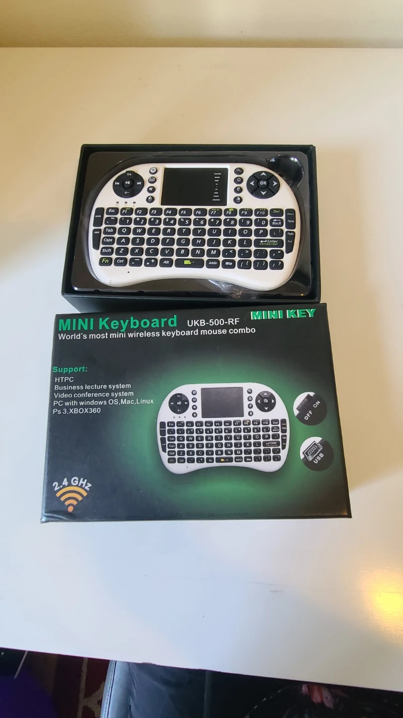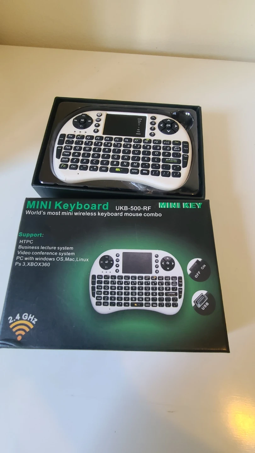 Selling a brand new Mini Keyboard UKB-500-RF wireless keyboard and mouse combo! It supports HTPC, business lecture systems, video conference systems, and PCs with Windows, OS, Mac, and Linux. Also compatible with PS3 and XBOX360. Includes a USB receiver and comes in its original box
