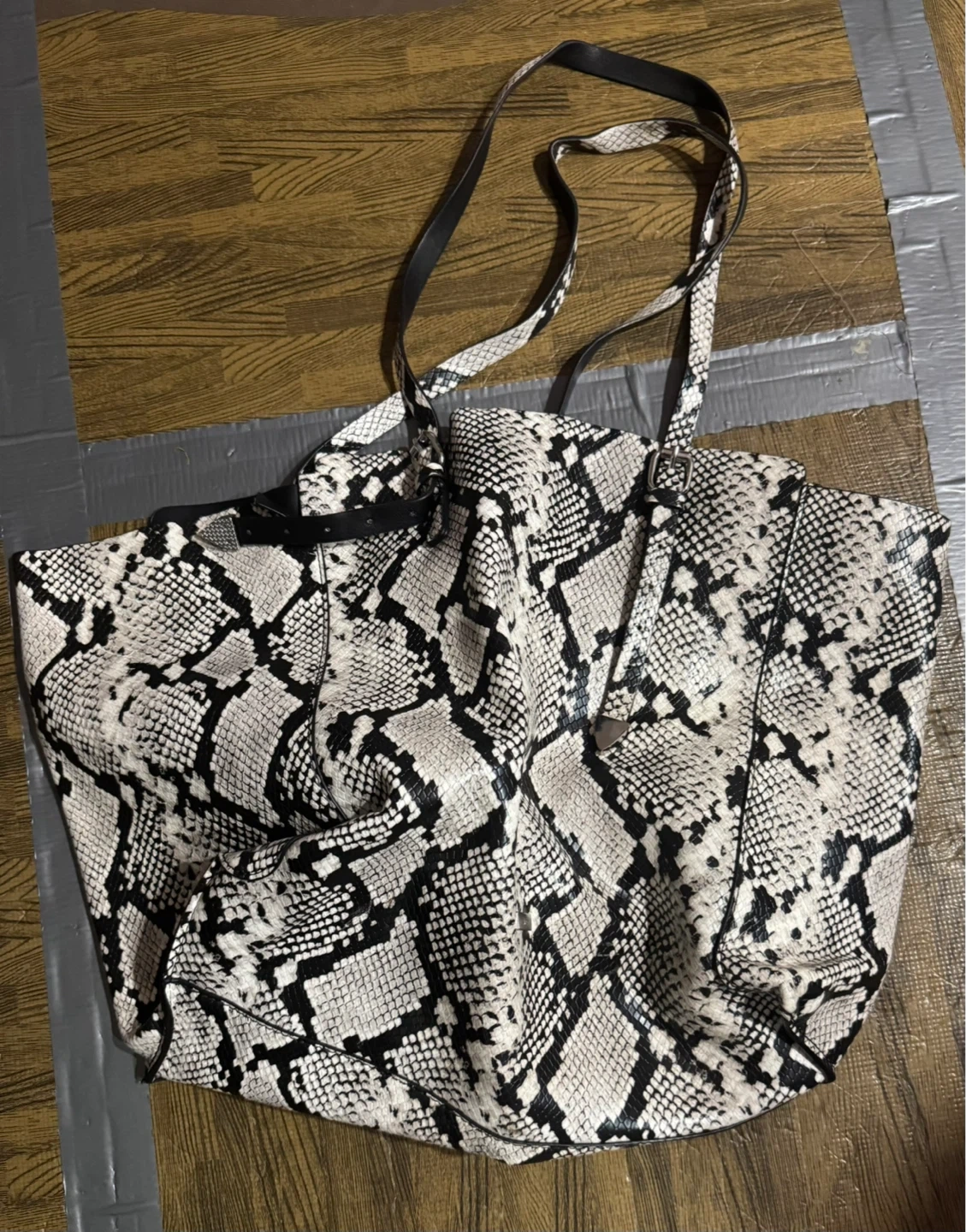 This large tote bag features a stylish black and white snake print. It has two shoulder straps for easy carrying. This bag is perfect for everyday use!