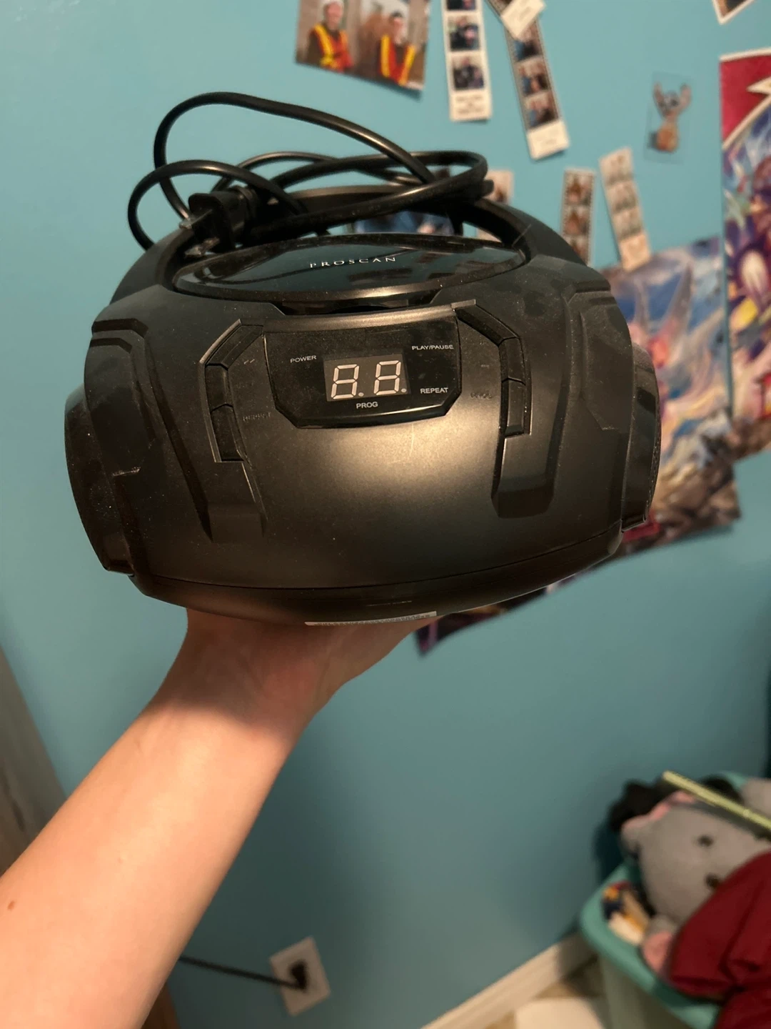 This is a Proscan portable CD player with a built-in radio. It's black and comes with the power cord. Works great for listening to music. Must go send offers!!!!!!