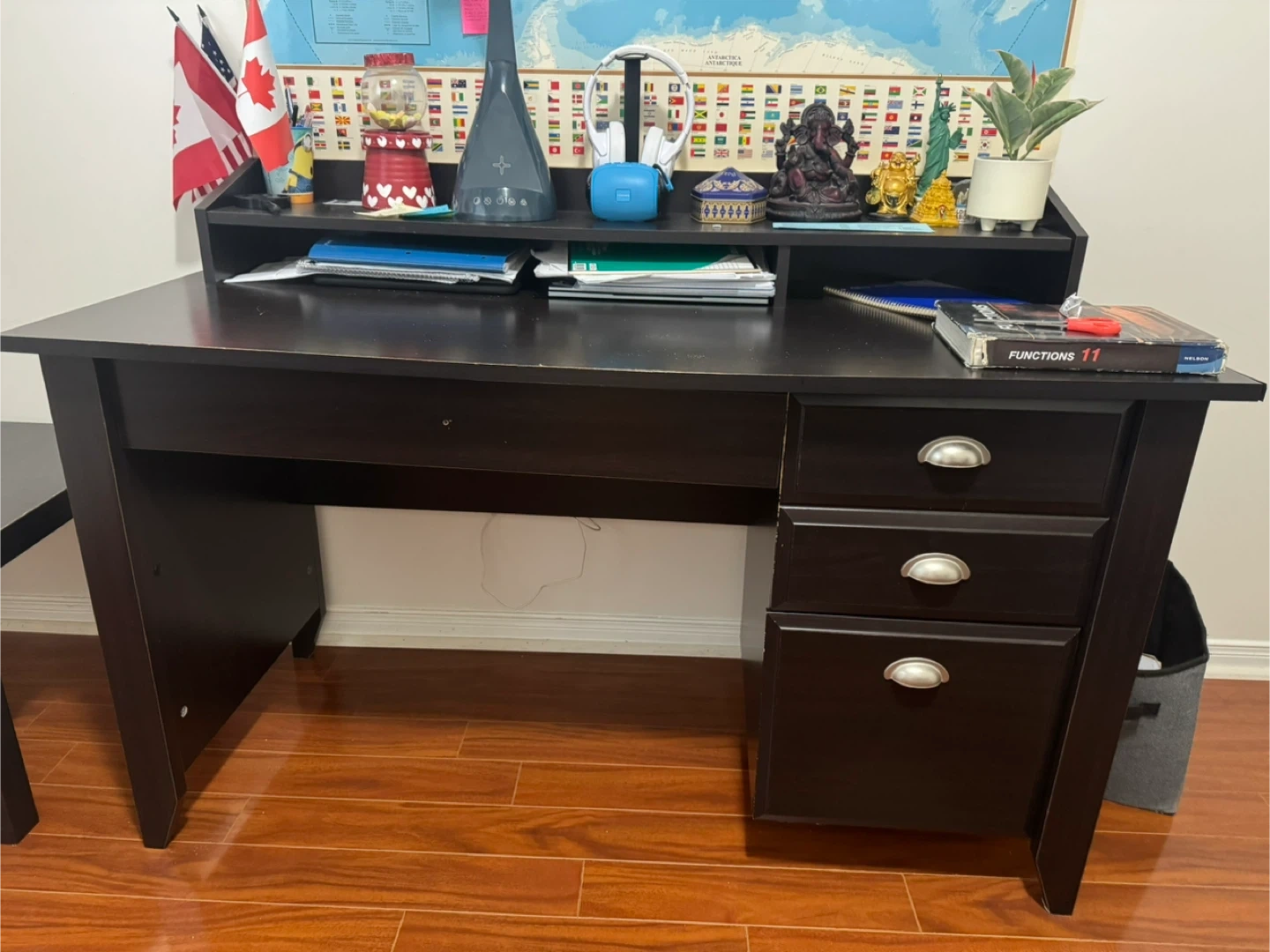 Dark brown solid wood computer desk with a hutch and three drawers. Plenty of surface space for work or study. It has a sturdy construction and a classic design.