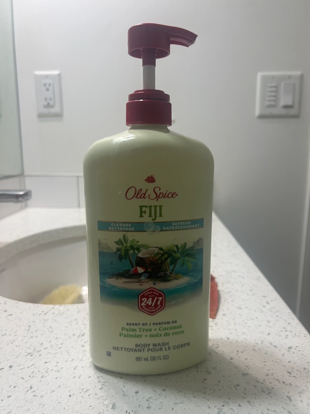 Old Spice Fiji body wash with a refreshing Palm Tree + Coconut scent. It's an 887 mL (30 FL OZ) bottle. Cleanses and refreshes for 24/7 shower fresh scent.
