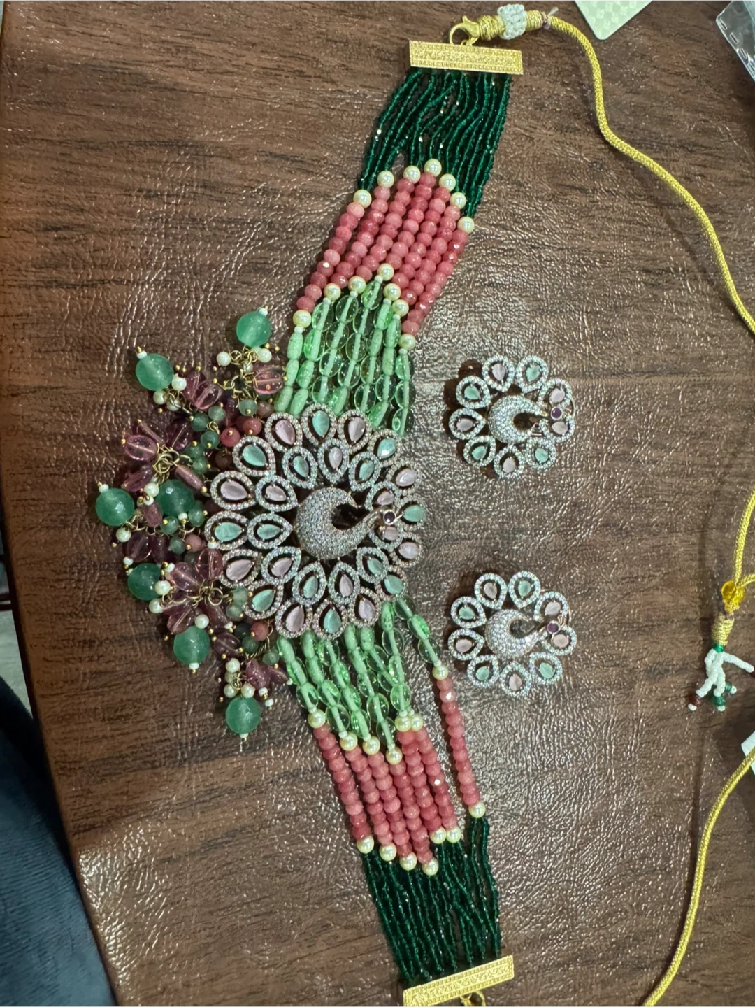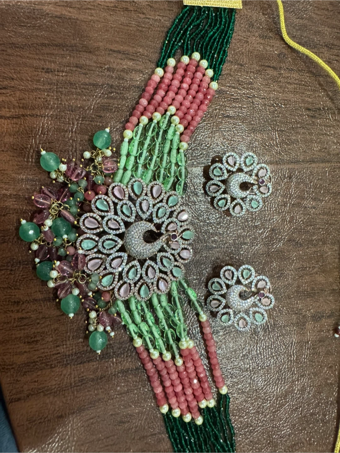 This beaded choker necklace set features a peacock design with pink, green, and gold beads. It includes matching stud earrings. The set's intricate beadwork and sparkling accents make it a statement piece.