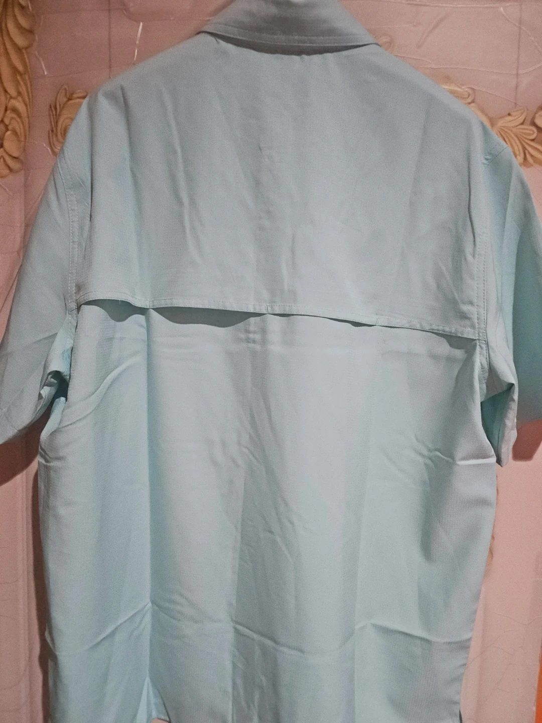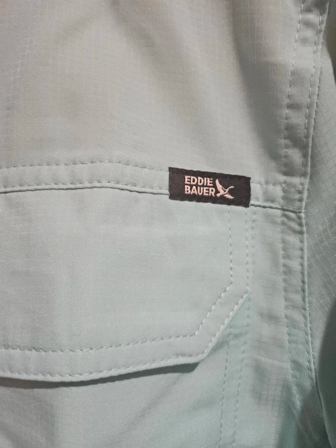 Eddie Bauer short sleeve men's shirt in light blue. Made of polyester. Size medium. It's a button-down style with two chest pockets and a zippered pocket.