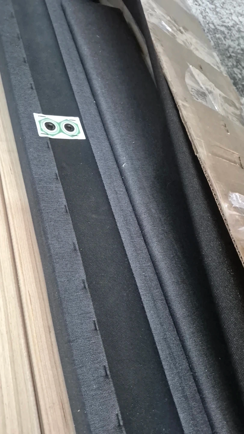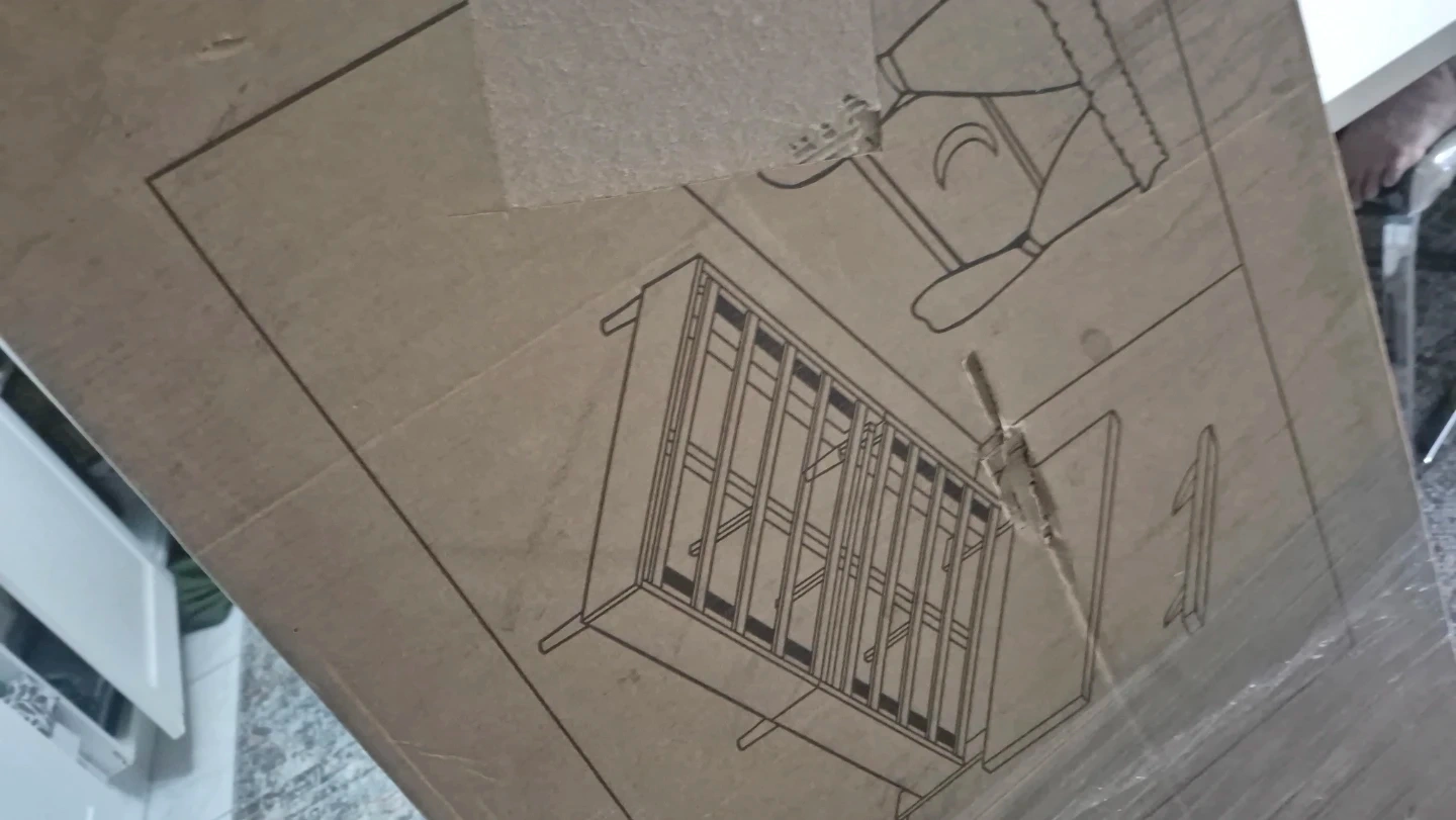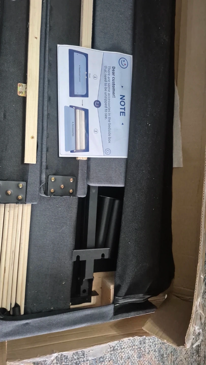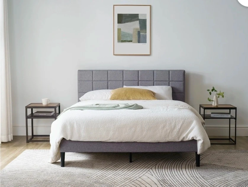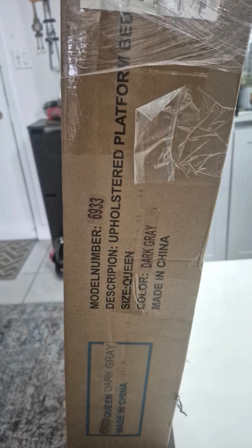 It's a grey upholstered bed frame with a plan design headboard. Includes metal legs and screws for assembly. This frame is designed for a .