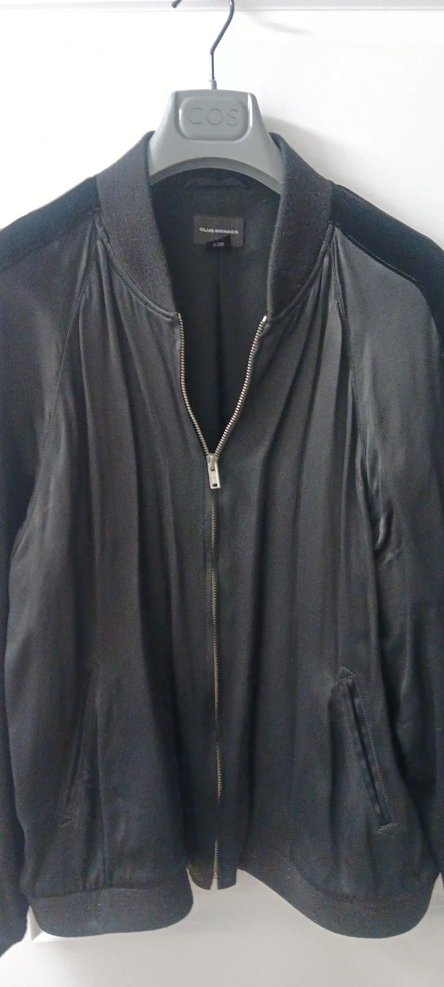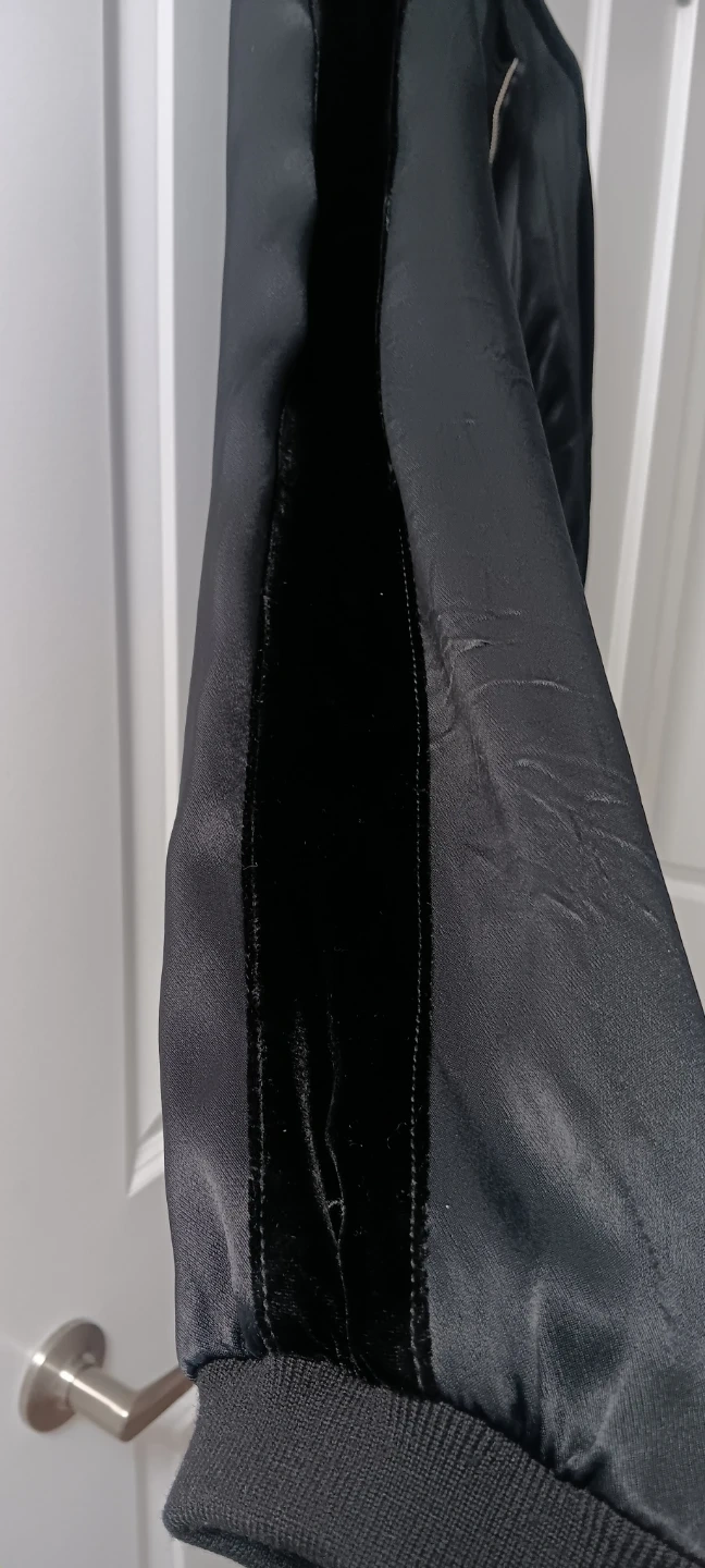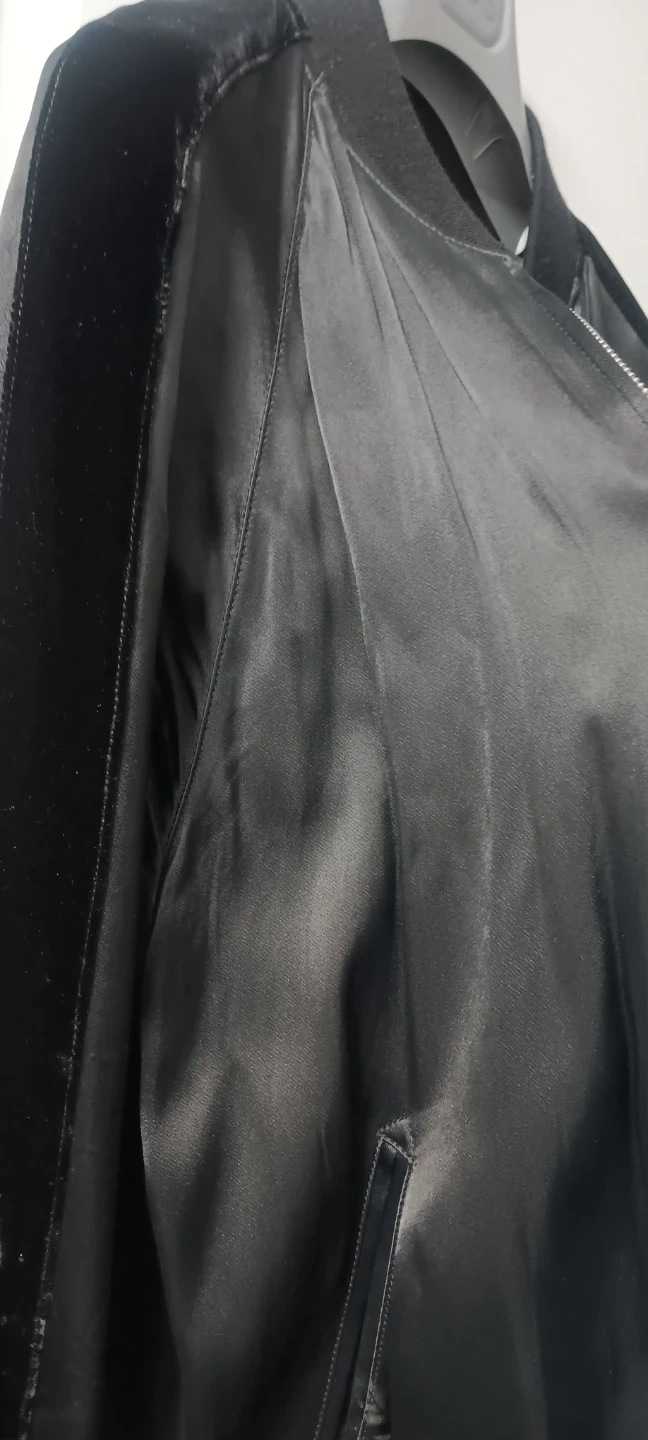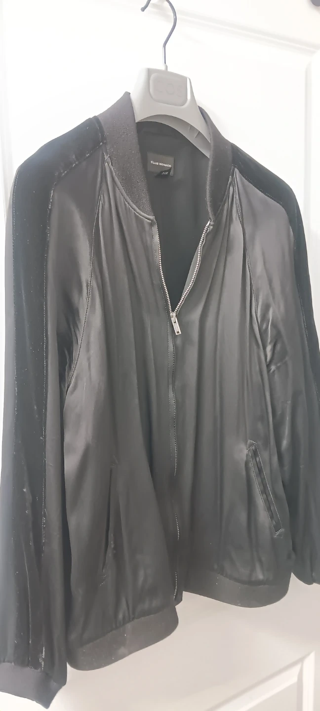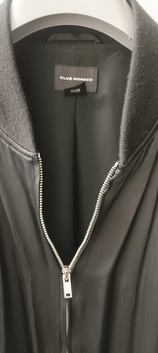 Black Club Monaco bomber jacket with velvet paneling on the sleeves. It's a stylish zip-up jacket. Great for layering over outfits.