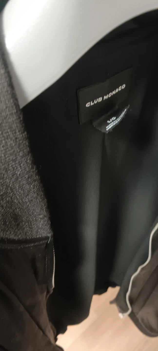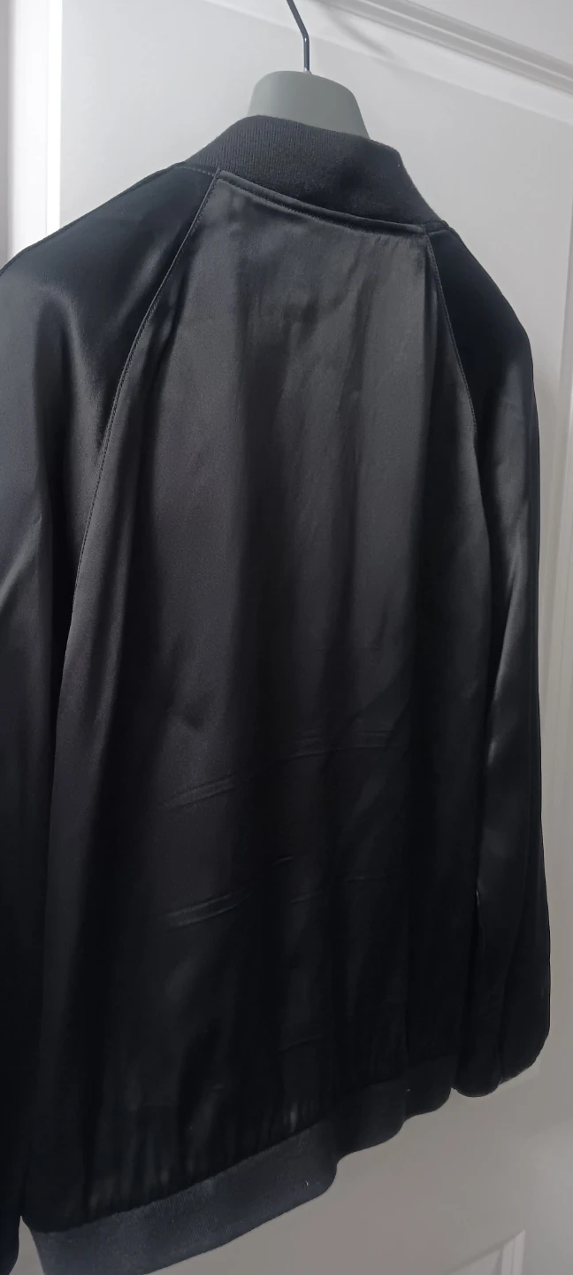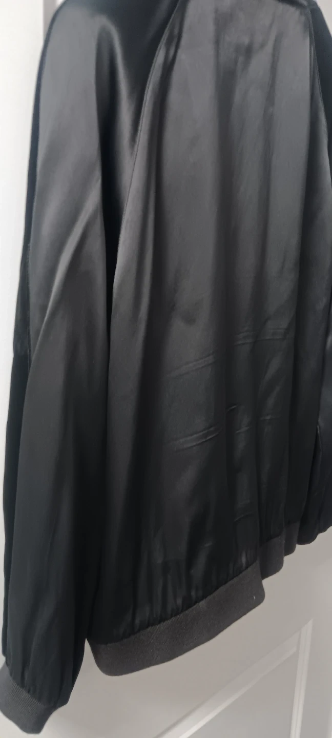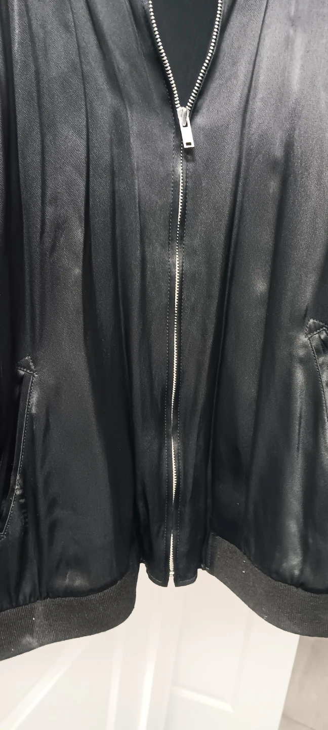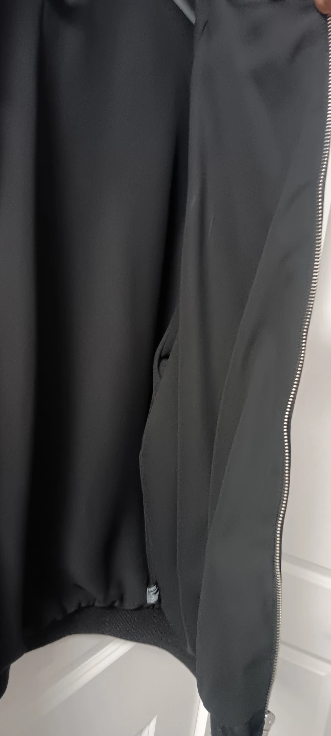 Black Club Monaco bomber jacket with velvet paneling on the sleeves. It's a stylish zip-up jacket. Great for layering over outfits.