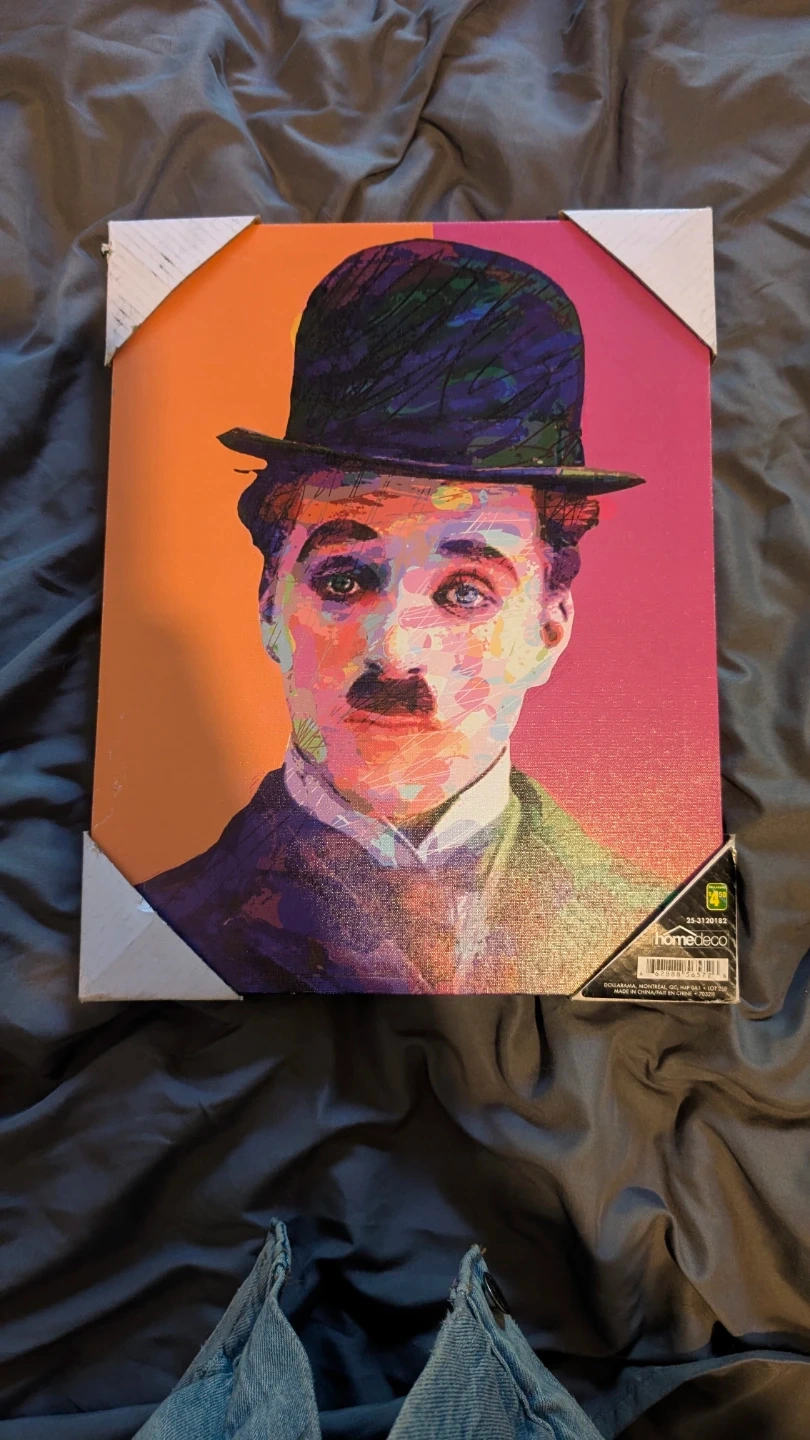 Deco art style canvas print of Charlie Chaplin. Bought this and decided I no longer wanted it before I could even hang it up ๐