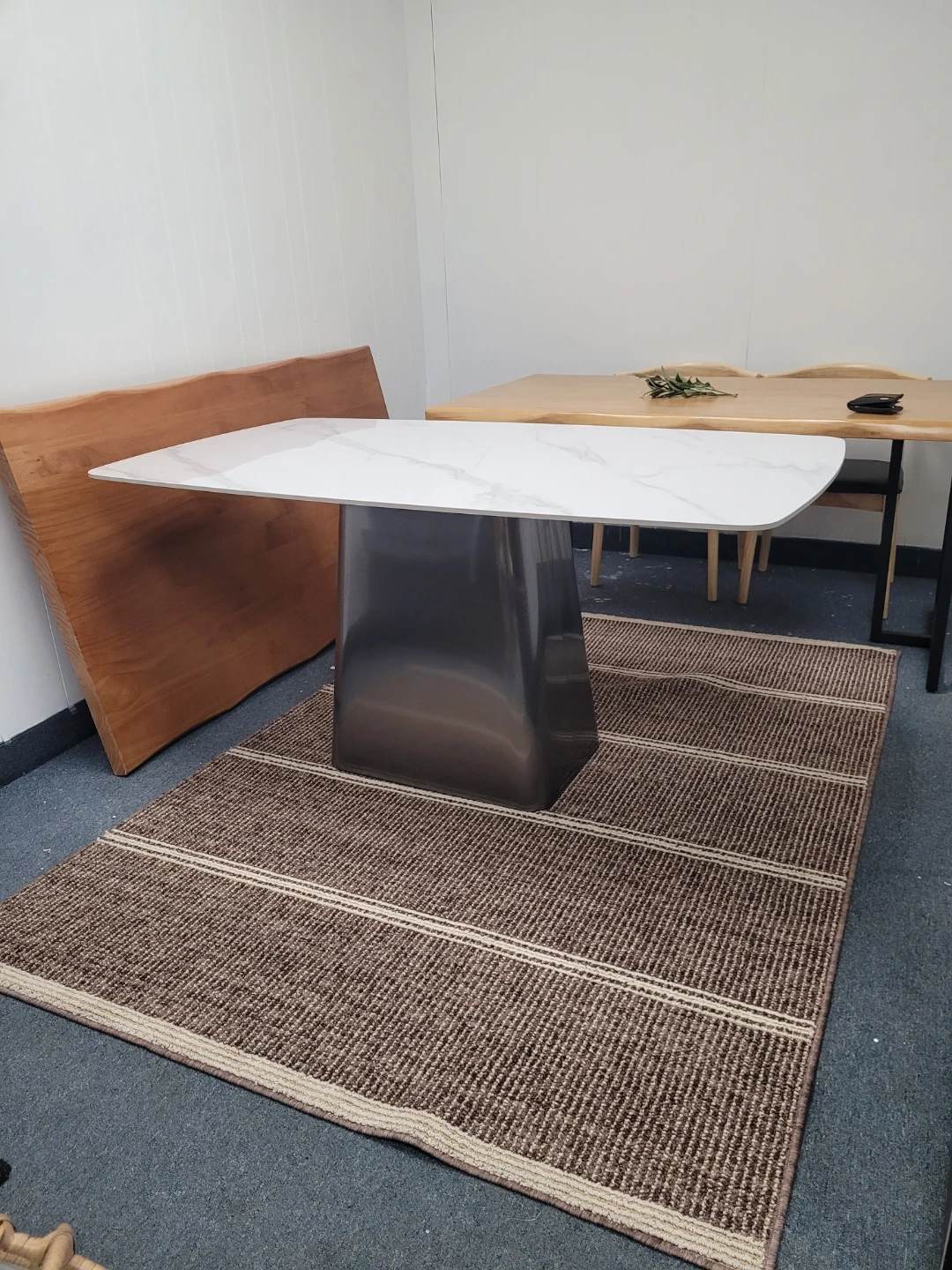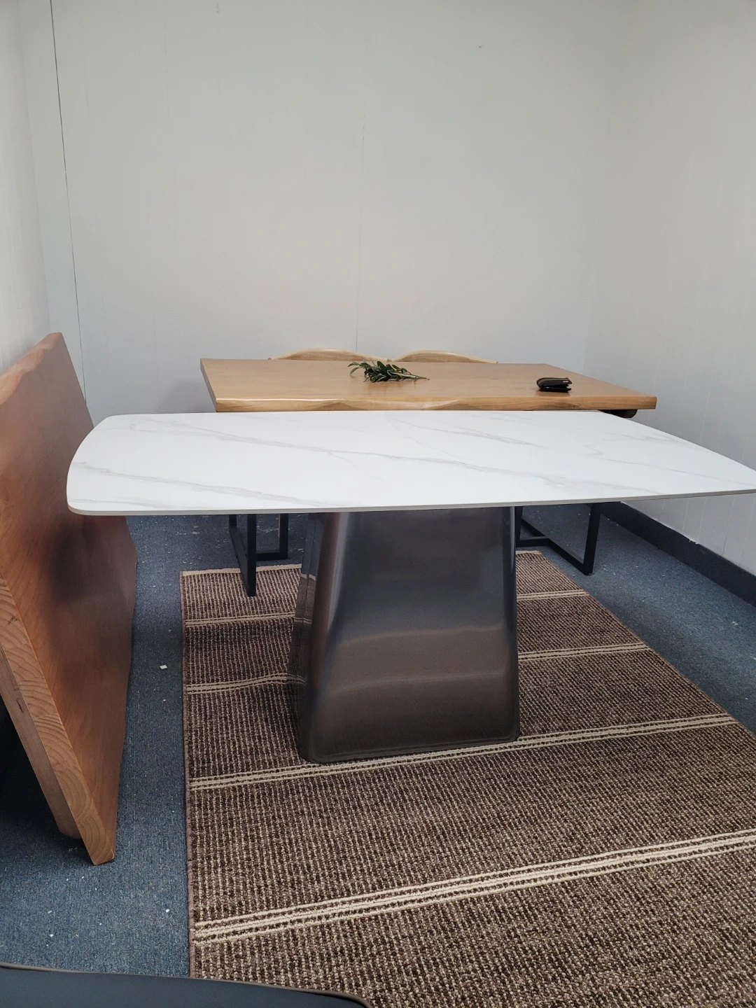 Stylish dining table featuring a white marble-look ceramic top and a dark grey pedestal base. It's a great size for everyday meals and entertaining guests. The clean lines and durable materials make it a practical addition to your dining space.