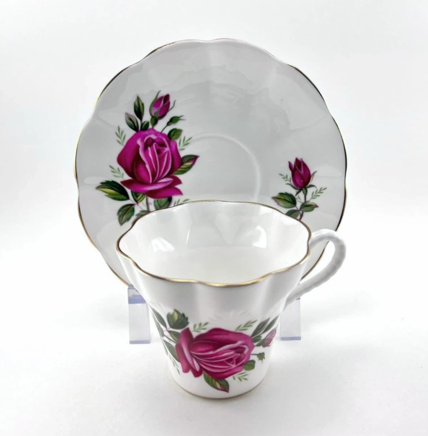 Vintage Rosina bone china teacup featuring large rose pattern. No chips, cracks, crazing or gold loss. Both pieces ping/ring