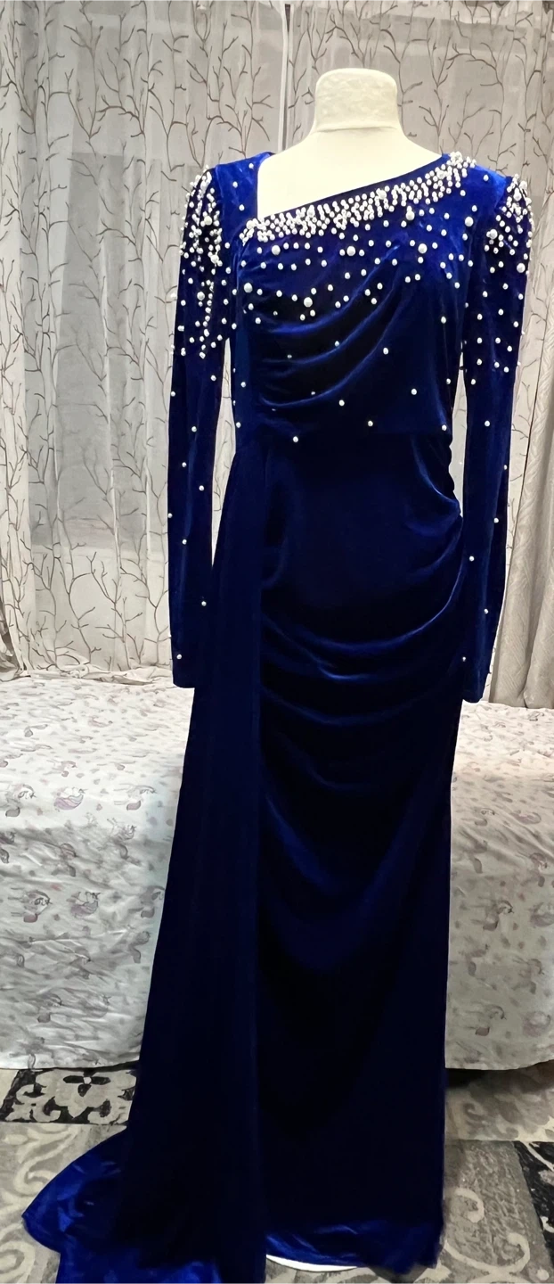 This stunning royal blue velvet dress features elegant pearl beading along the neckline and sleeves. It has a flattering ruched detail on the side with a side slit. Perfect for a special occasion!