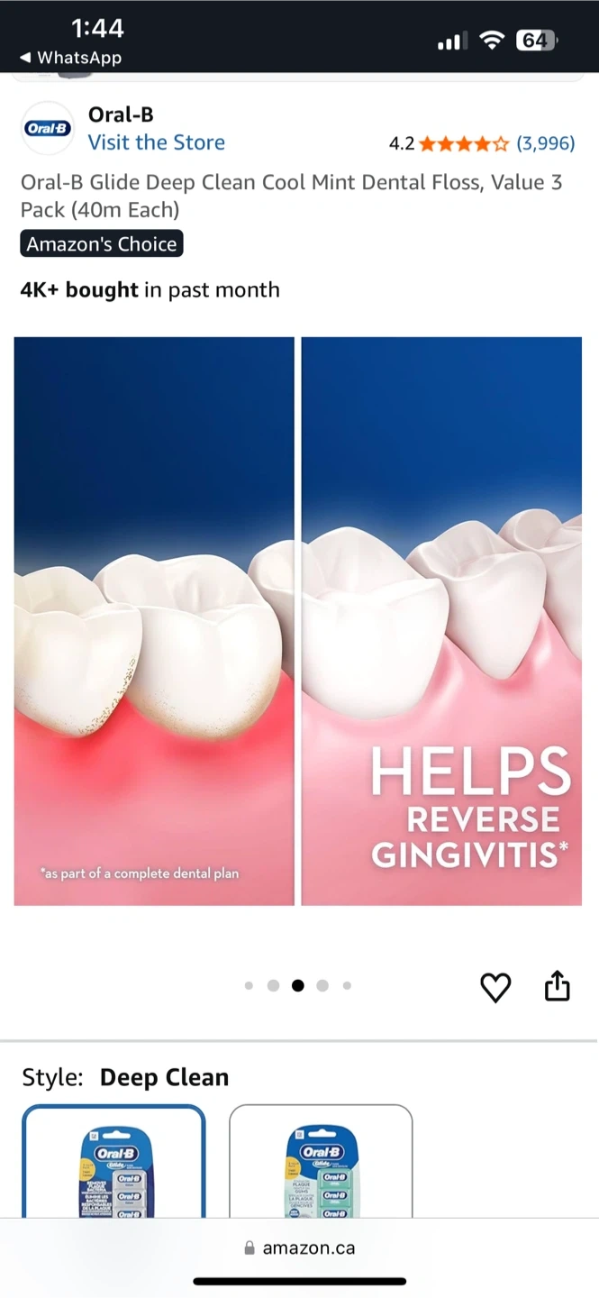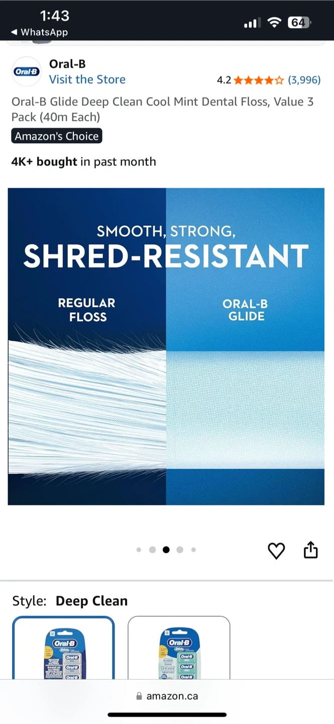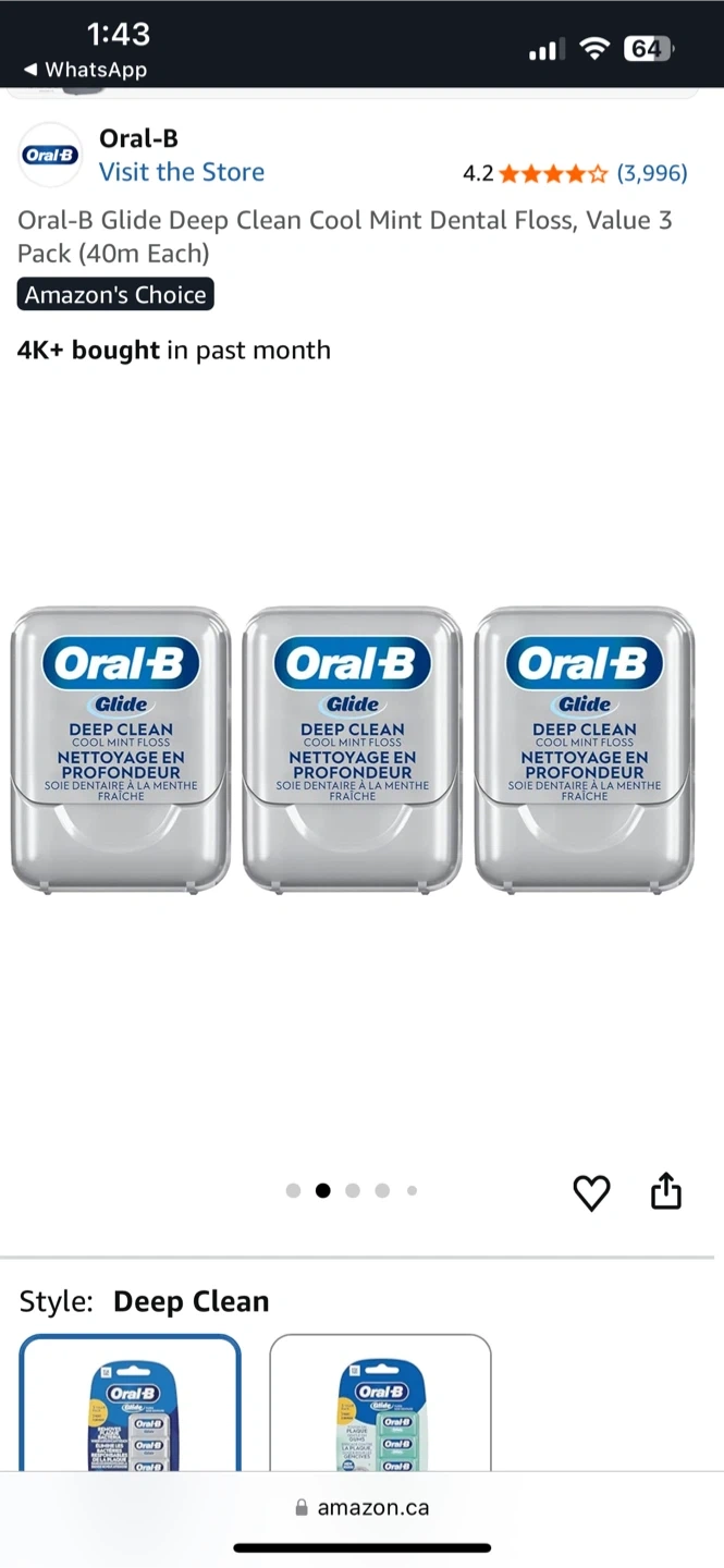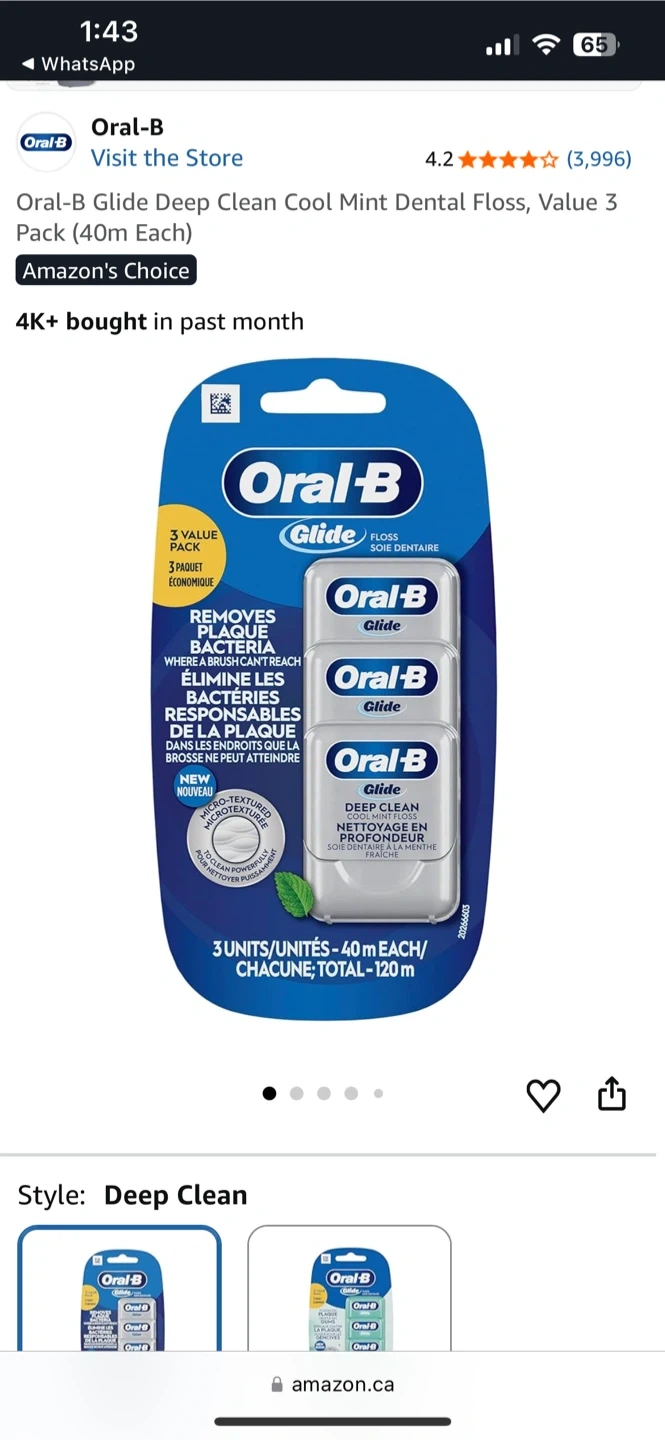 Oral-B Glide Deep Clean Cool Mint dental floss. This value pack includes 3 units, each 40m long. It's smooth, strong, and shred-resistant for easier cleaning between teeth.