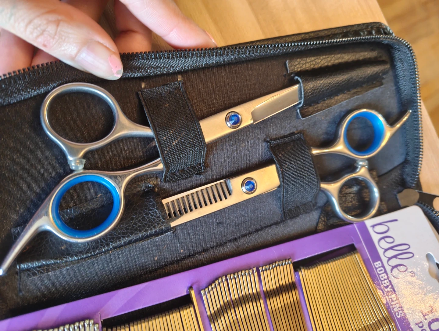 This Belle Professional kit includes a pair of hair cutting shears and a comb shear, all housed in a black zipper case. It also comes with a package of 100 gold bobby pins. Perfect for home haircuts or styling touch-ups!