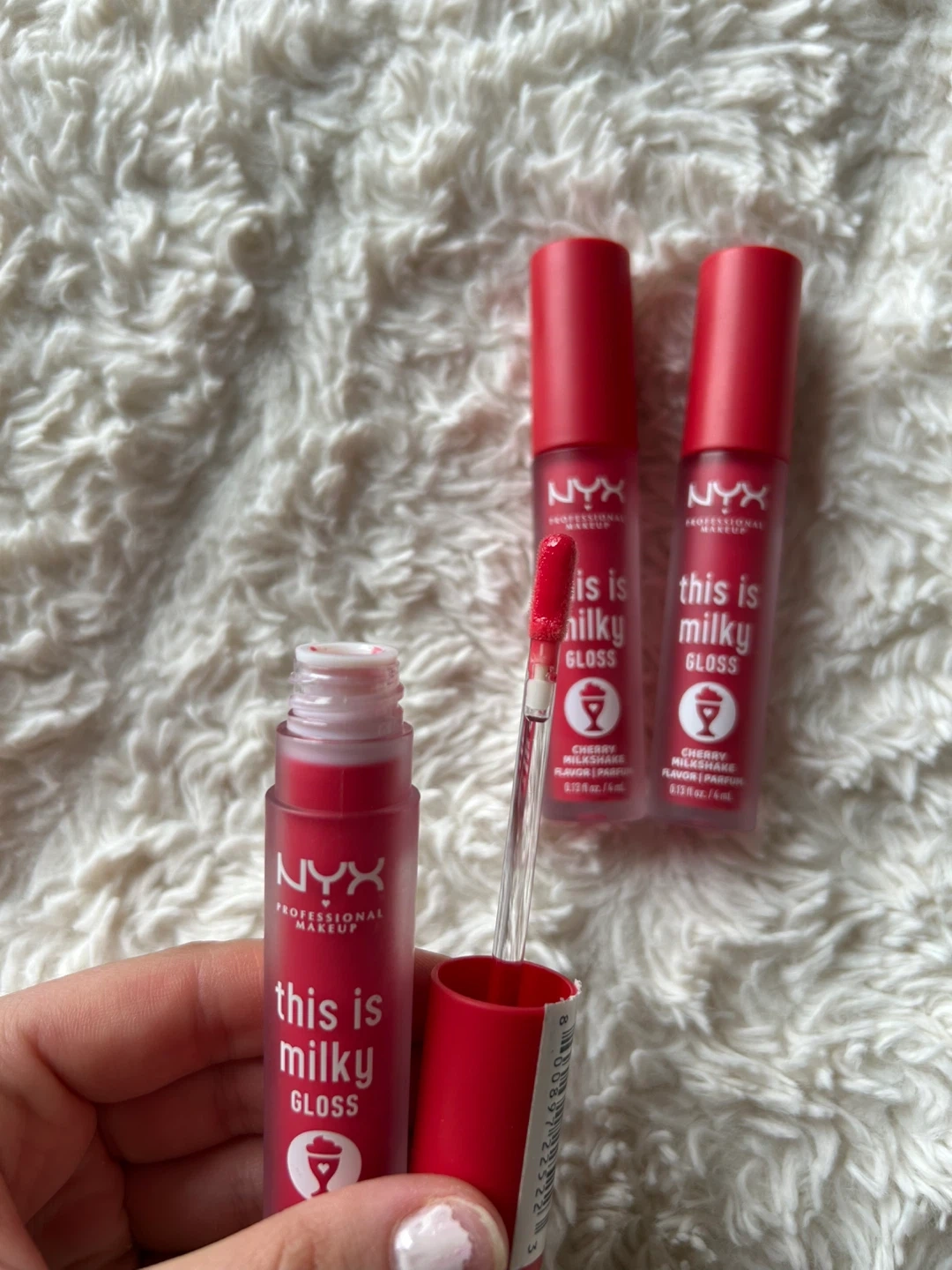 Three NYX This is Milky Gloss lip glosses in the Cherry Milkshake flavour. It's a creamy, hydrating formula for a soft pout. Great for a subtle, glossy look!