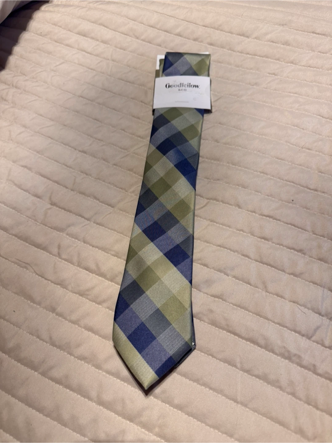 A Goodfellow & Co tie with a green, blue, and tan plaid pattern. It's made with at least 50% recycled polyester. Care instructions say dry clean only.