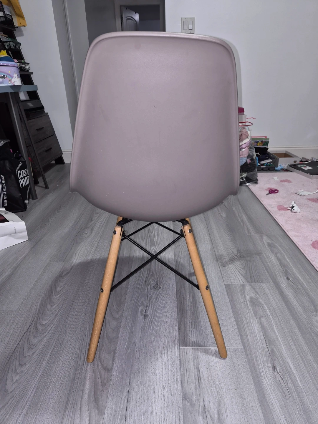 This chair has a moulded grey seat and natural wood legs. It's a stylish addition for any dining area or workspace. A comfy seat for everyday use!