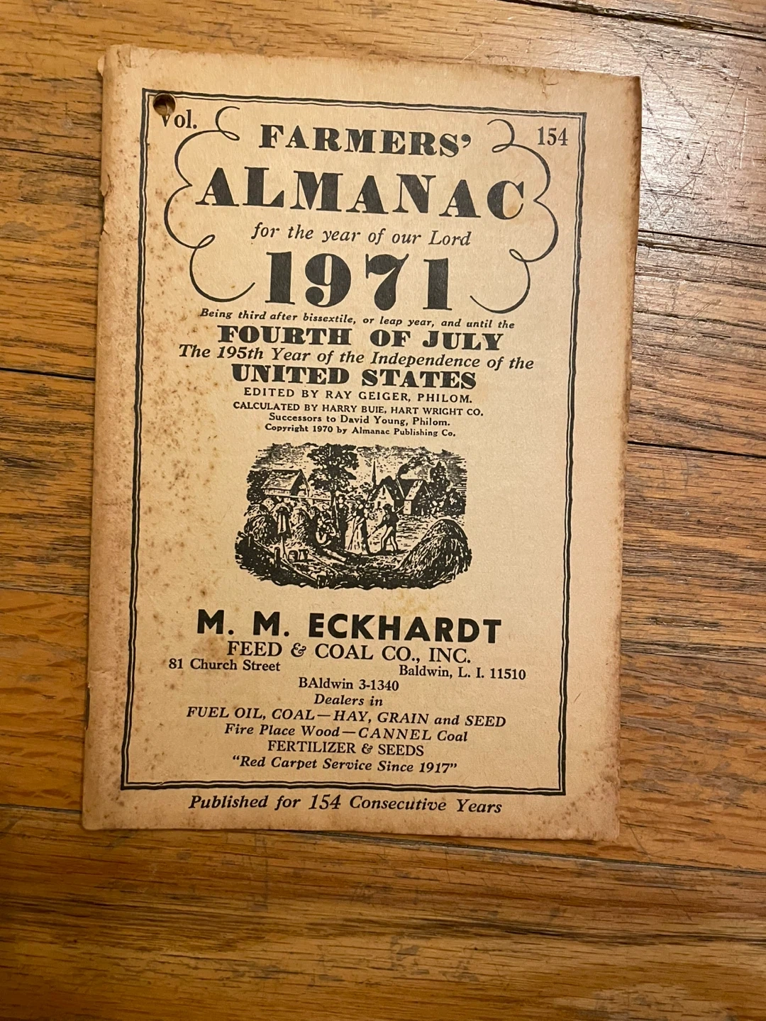 This is the 1971 Farmers' Almanac, published for the 195th year of the United States. It contains calculations and information for the year. M. M. Eckhardt Feed & Coal Co. was a dealer for this publication.