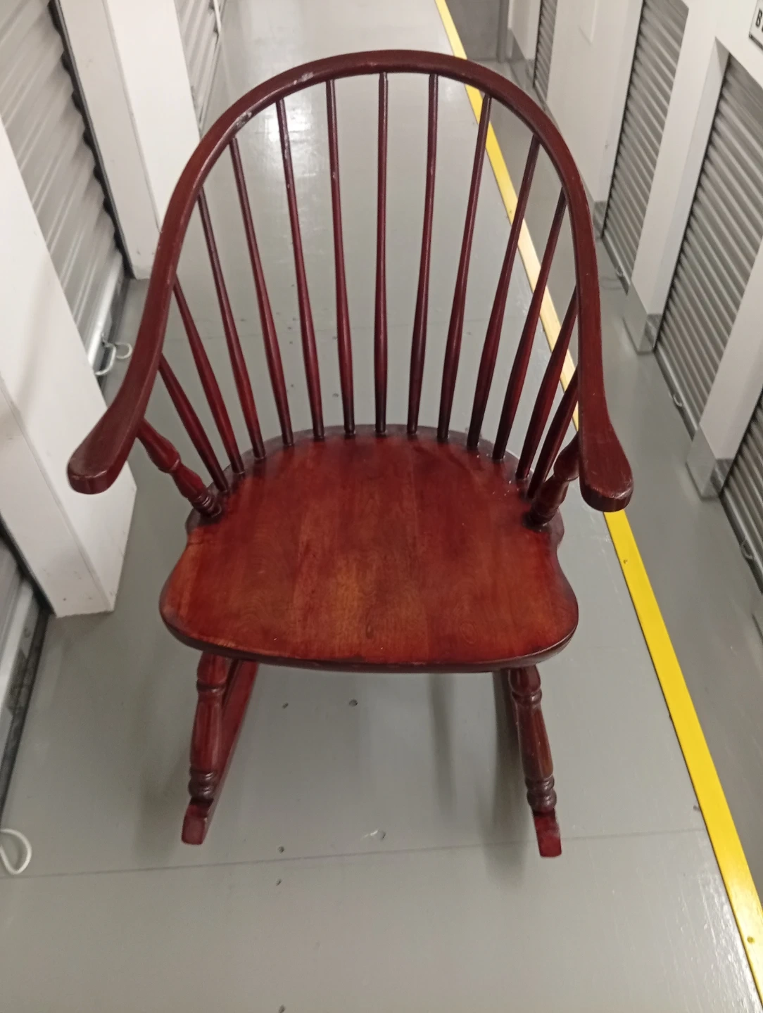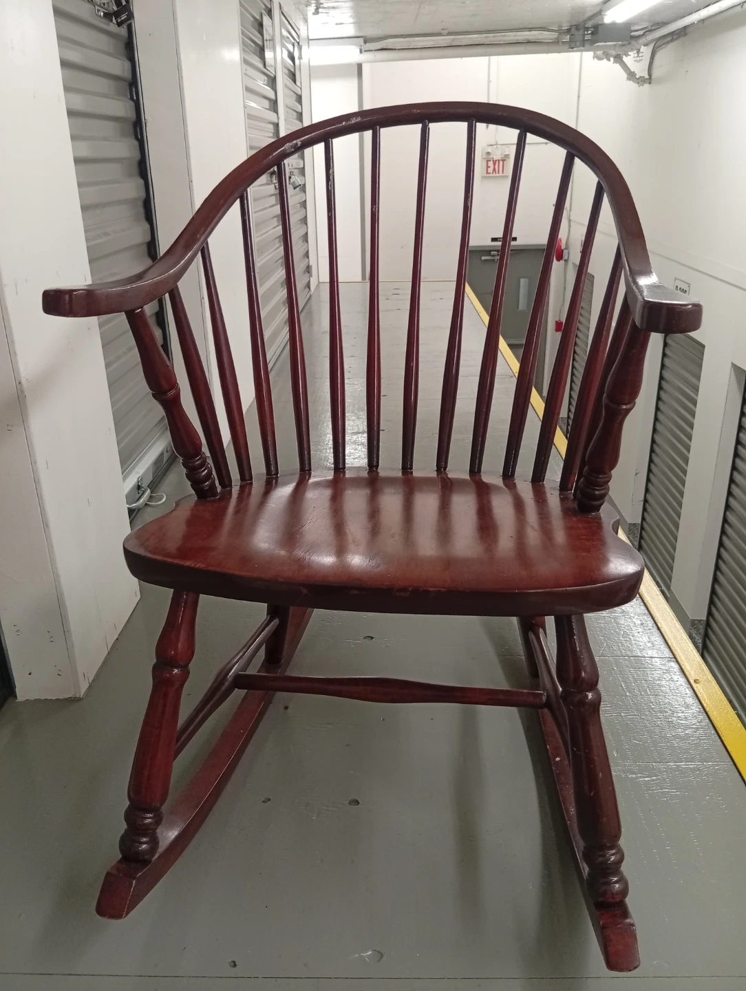 This is a classic wooden rocking chair with a deep red stain. It features a spindle back and curved arms for comfort. The chair is made of solid wood.