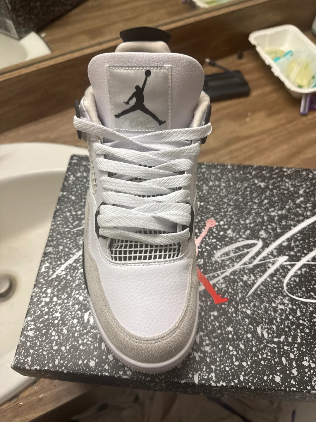 Selling a pair of Air Jordan 4 Retro in white, black, and neutral grey. They are a men's size 9.5 (UK 8.5, EUR 43, 27.5 cm). Comes with the original box!
