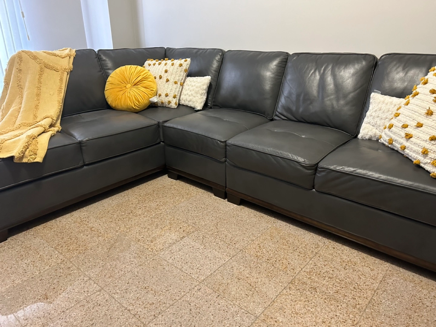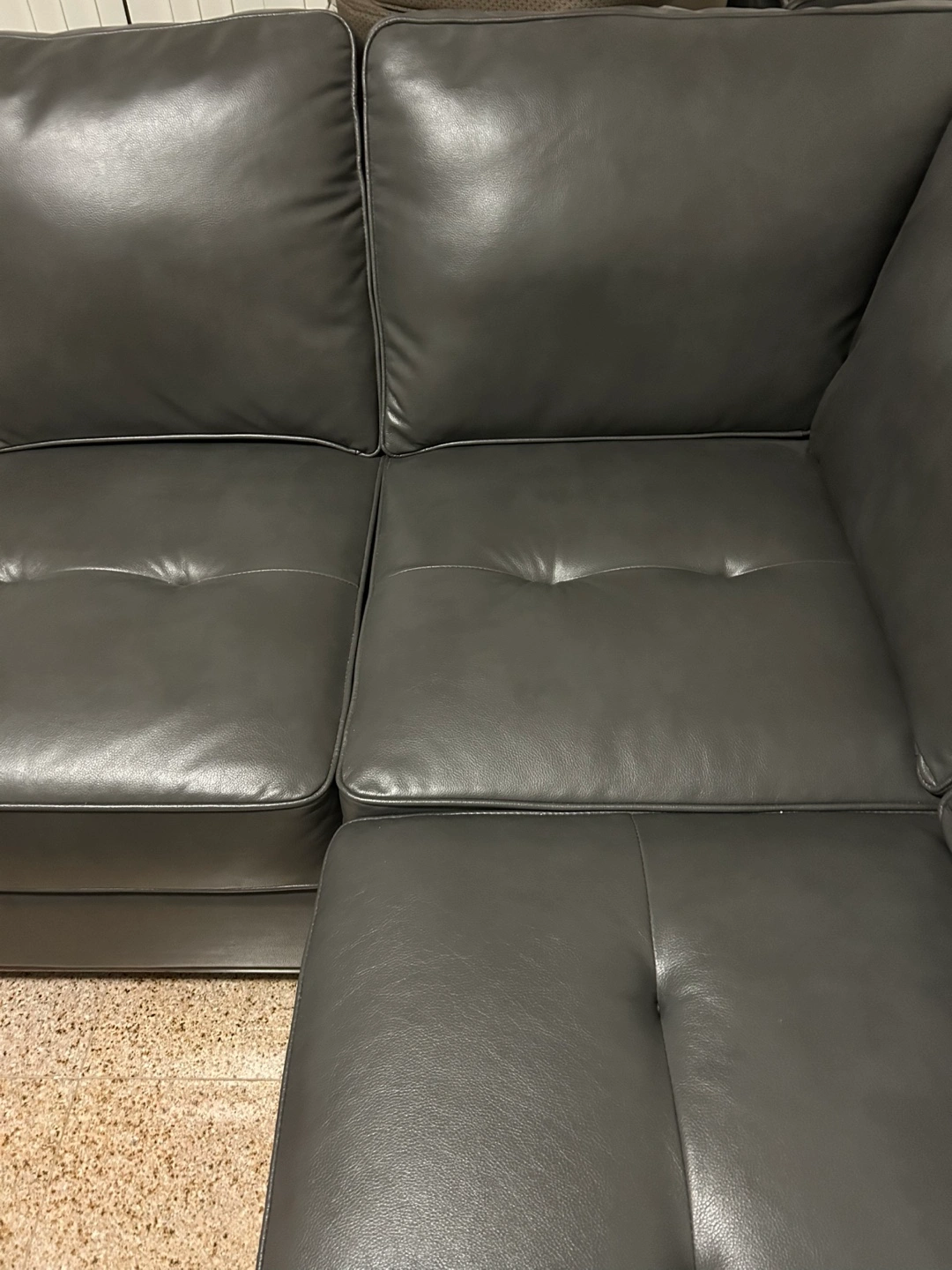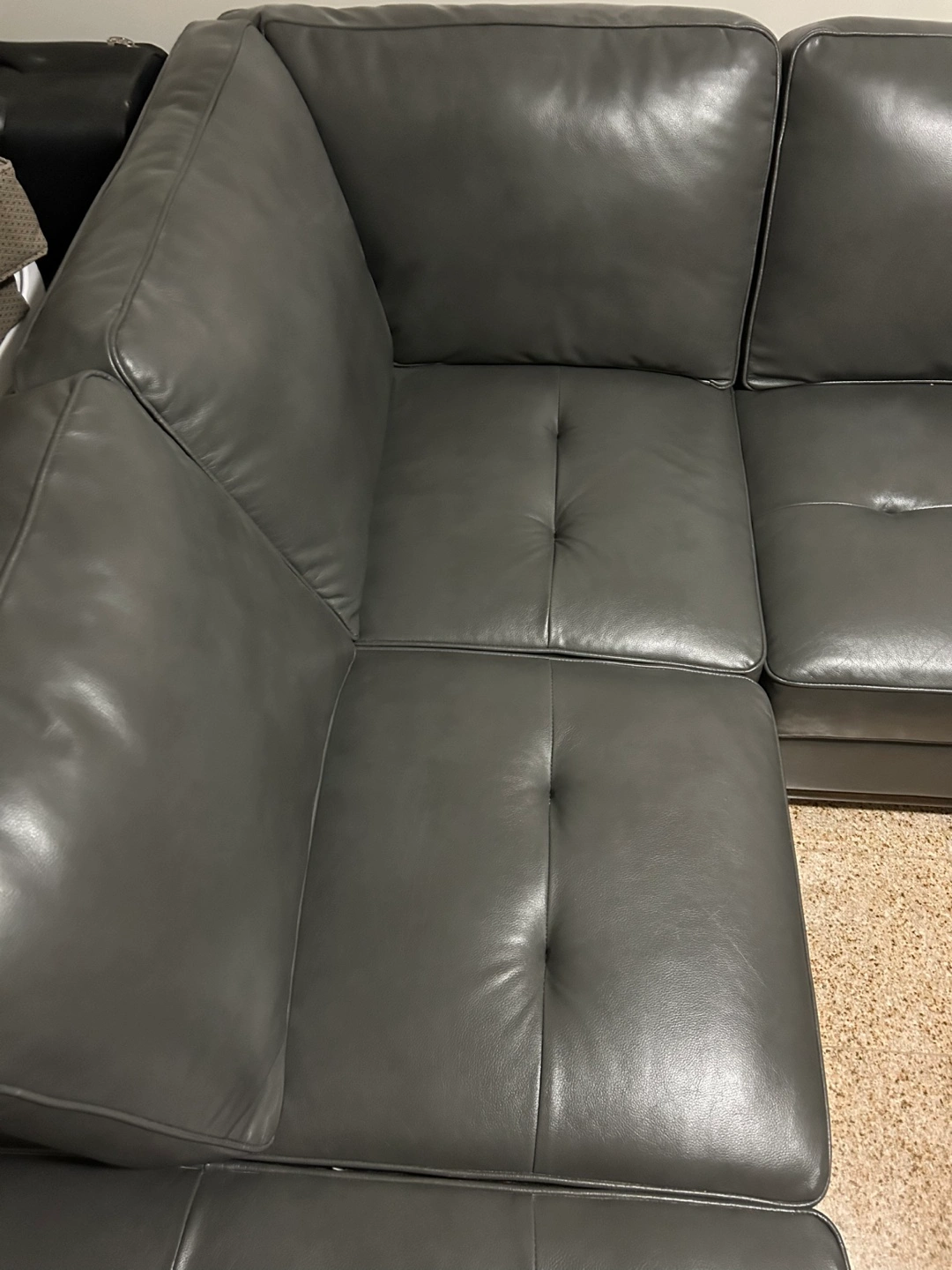 Spacious L-shaped sectional sofa. Dark grey faux leather upholstery. Modern and comfortable design. No scratches, rips or tears as it is kept in the basement where we rarely use.