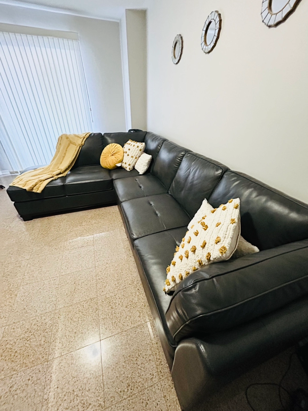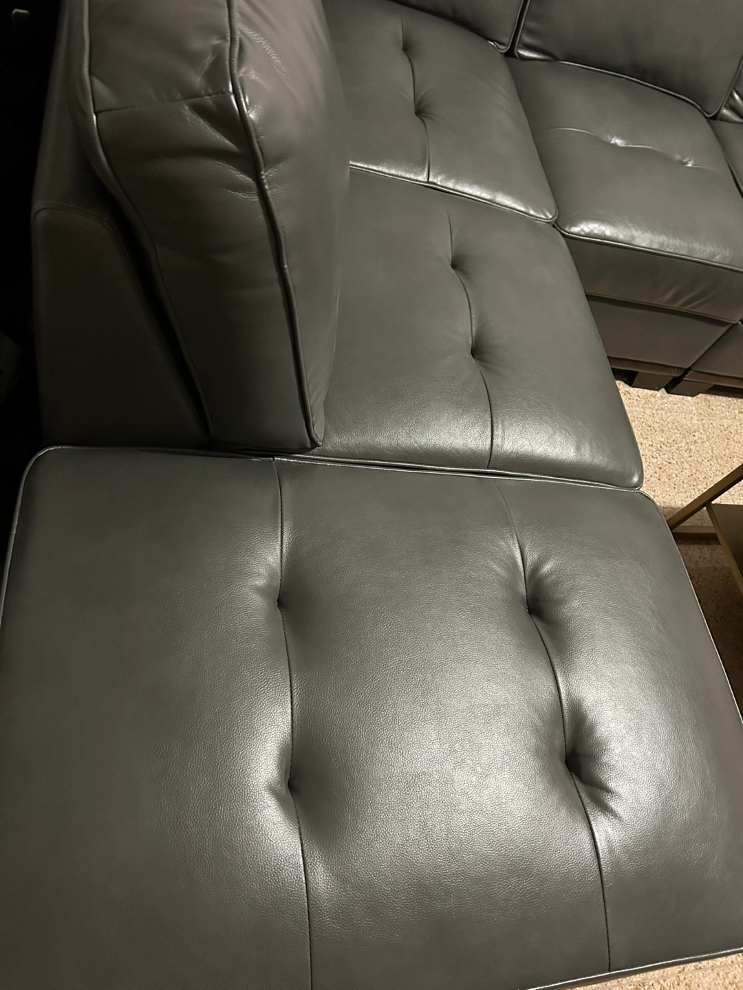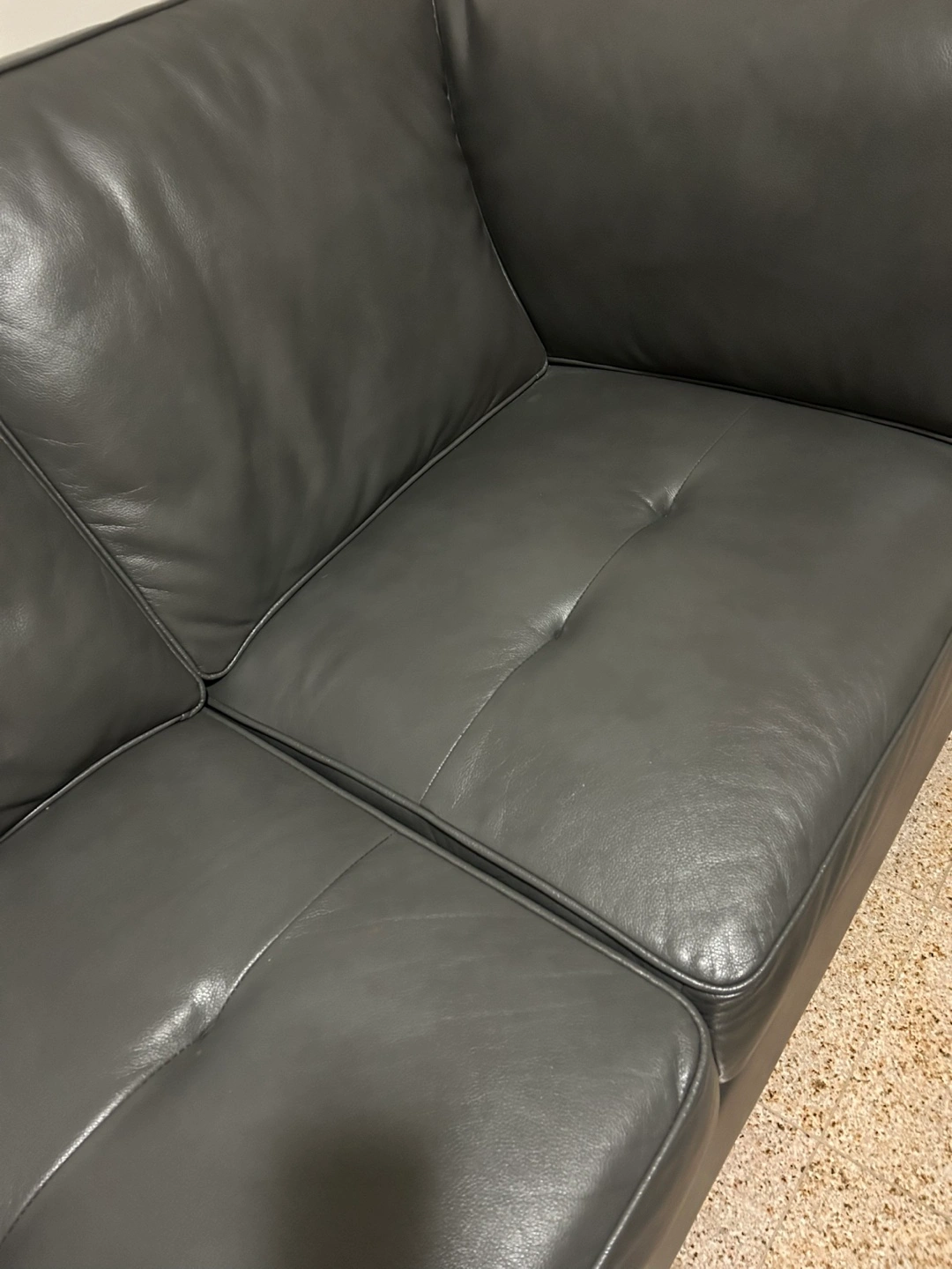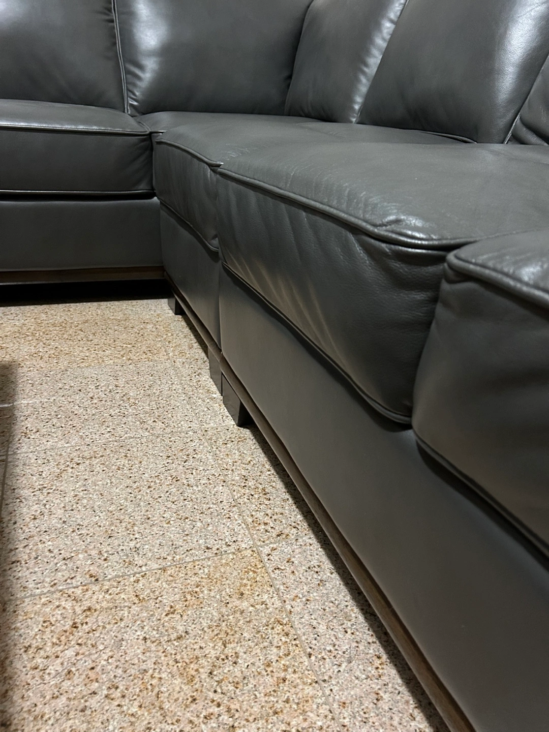 Spacious L-shaped sectional sofa. Dark grey faux leather upholstery. Modern and comfortable design. No scratches, rips or tears as it is kept in the basement where we rarely use.