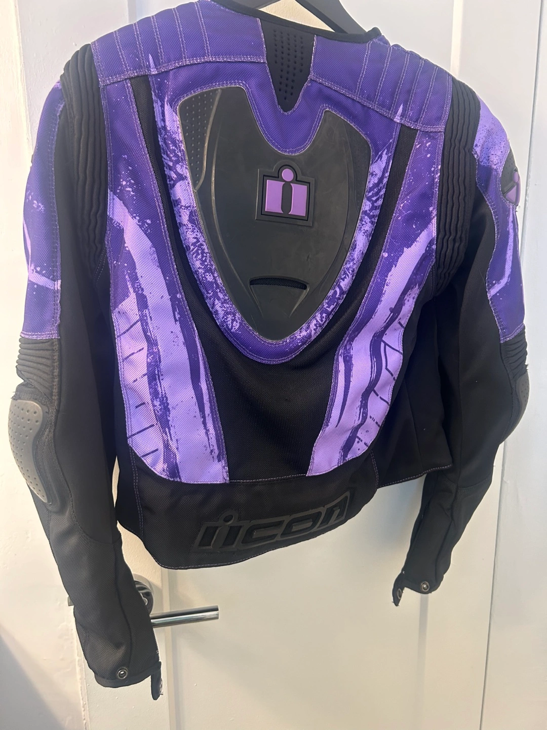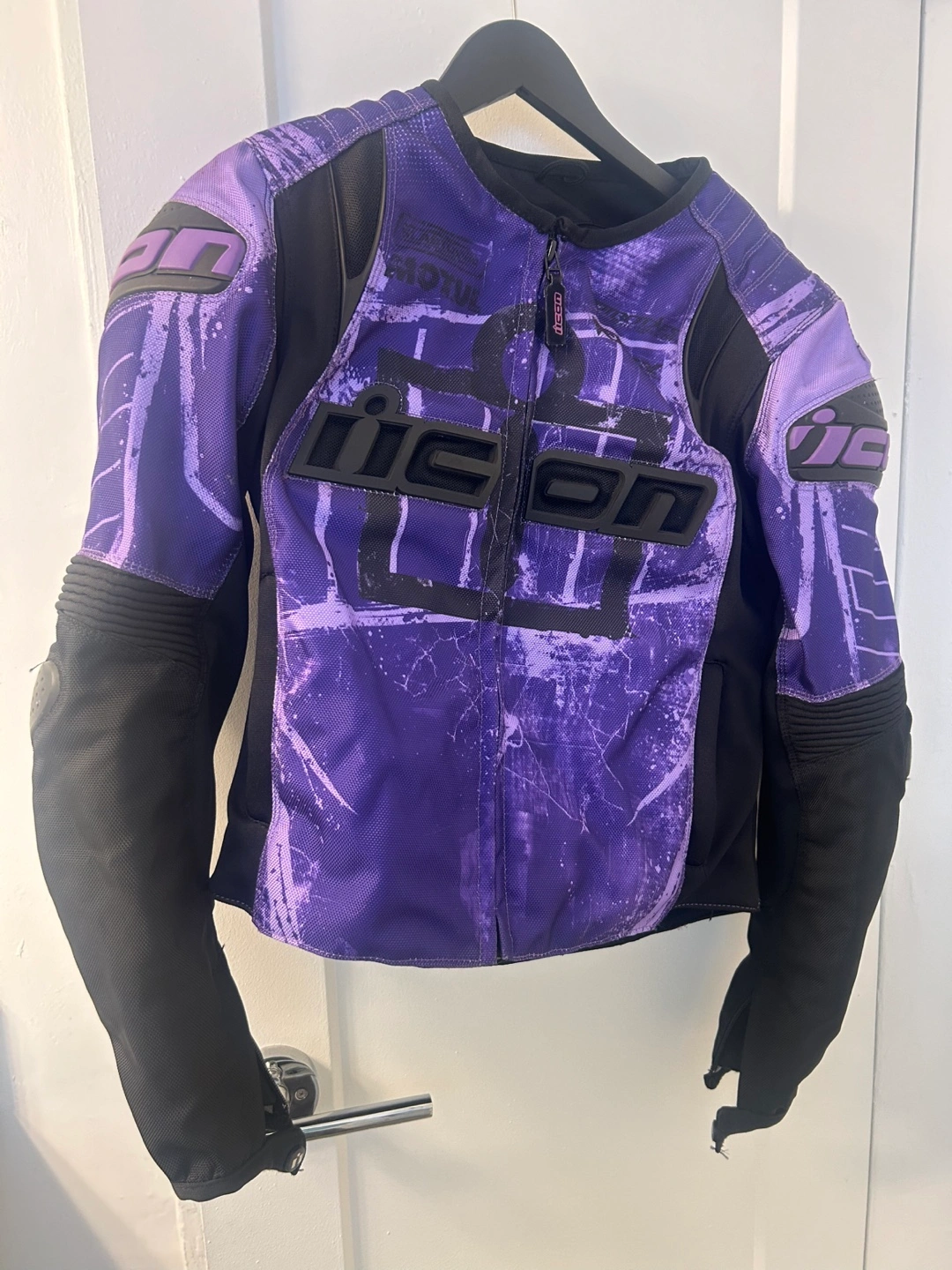 Selling used almost like new small Icon women's motorcycle jacket. Back, elbow & forearm protection. Little scuff on right elbow shown in photo but very well kept. Removable insulated liner. Nice bright purple colour is eye catching :)