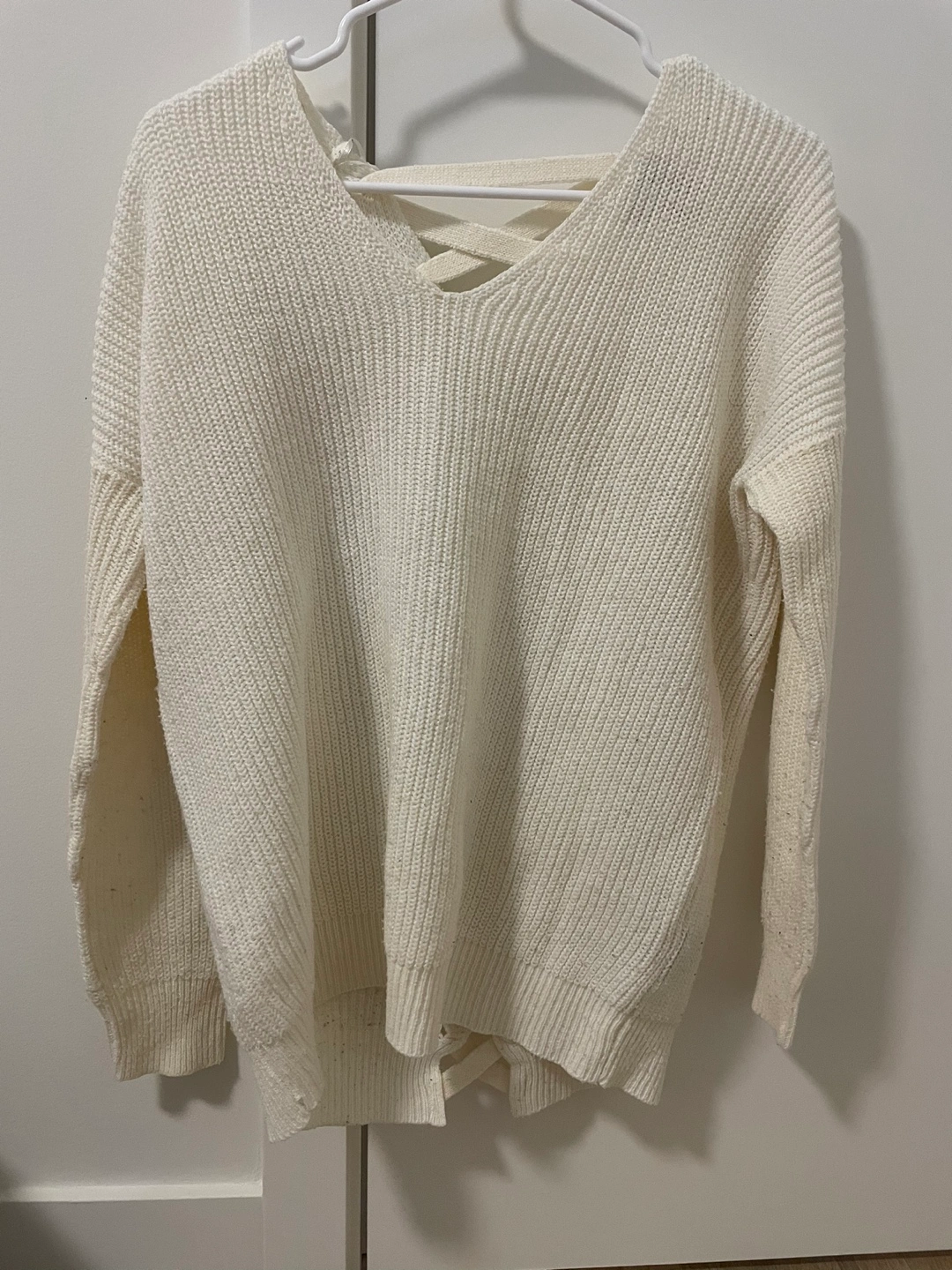 Women's cream knit sweater. Features a V-neck and unique criss-cross lace-up detail at the back. Long sleeves. Relaxed fit. Soft and comfortable material. Perfect for layering or wearing on its own.