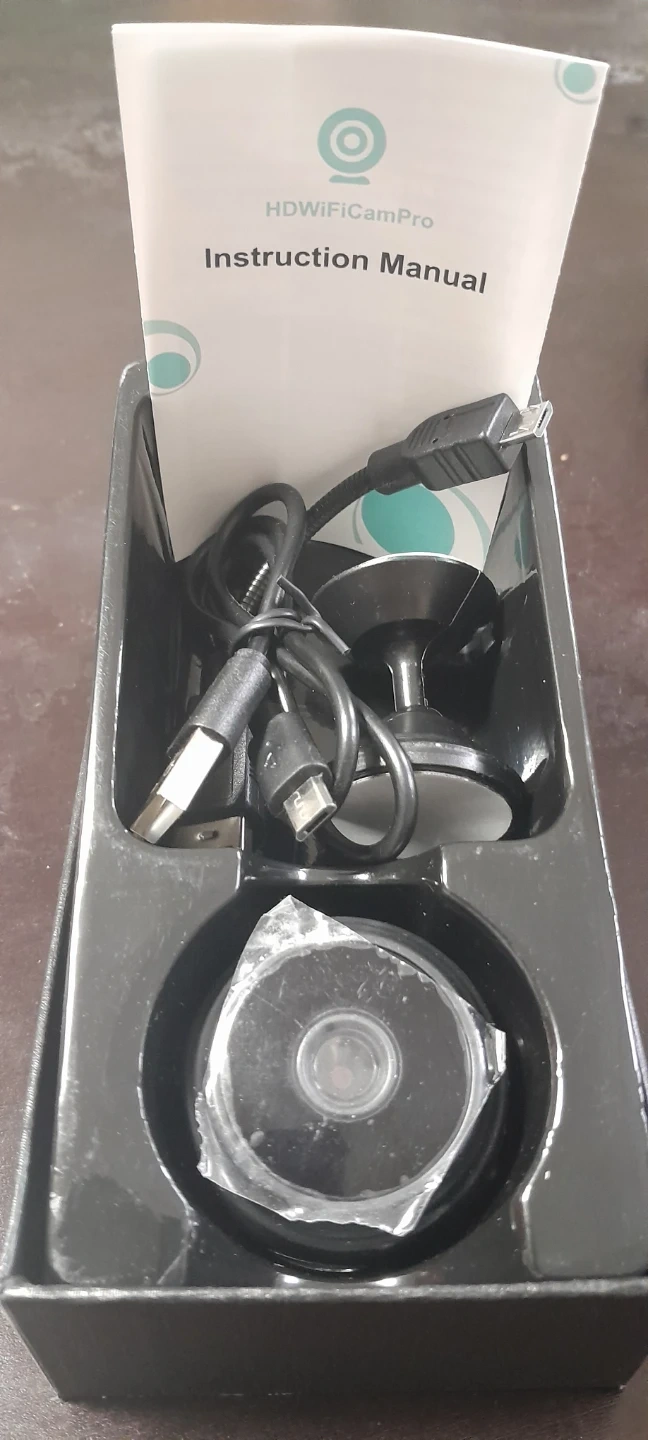 This is a HdWifiCamPro camera with its instruction manual and charging cable. Includes a mount accessory. Small and discreet.