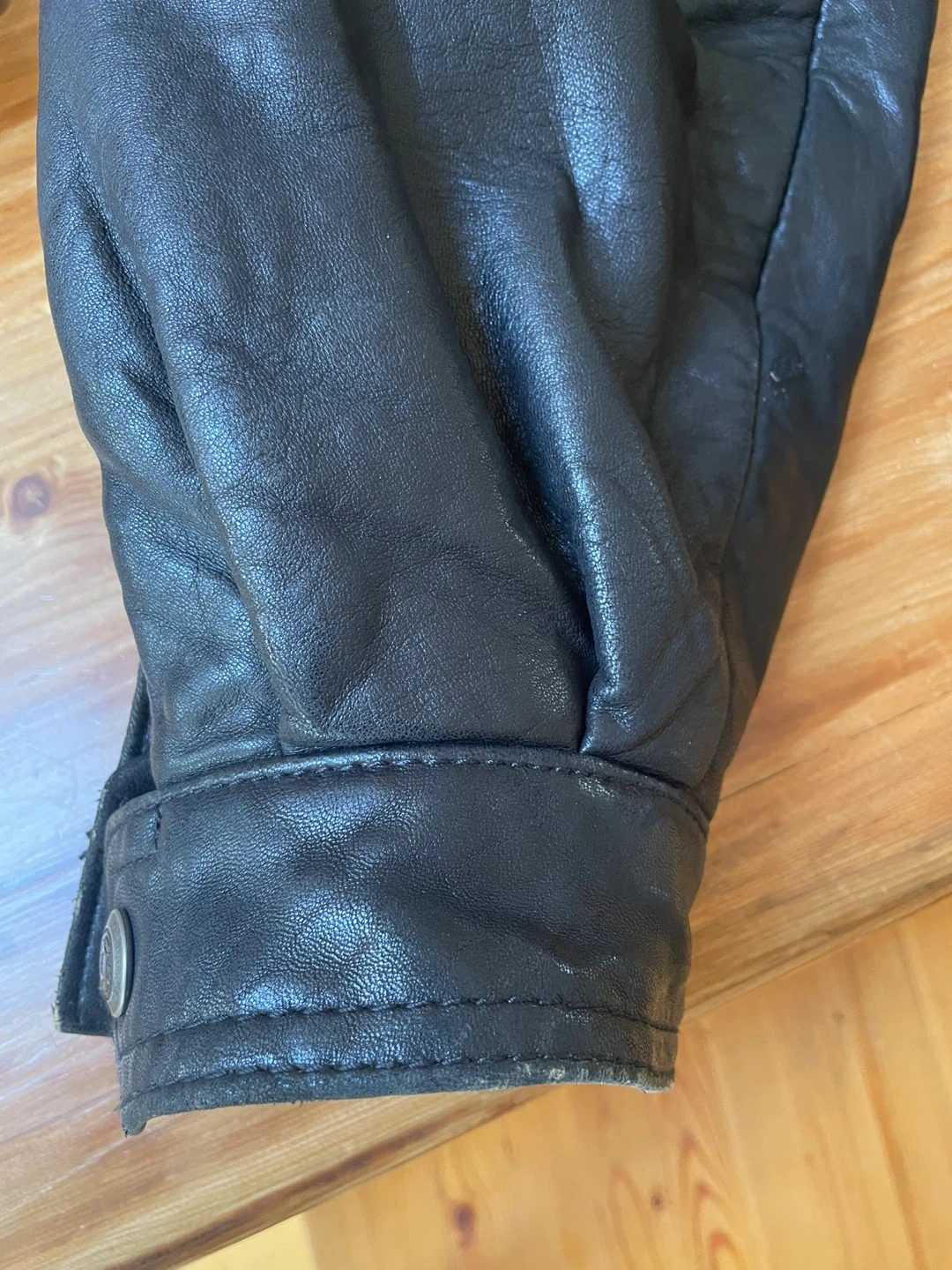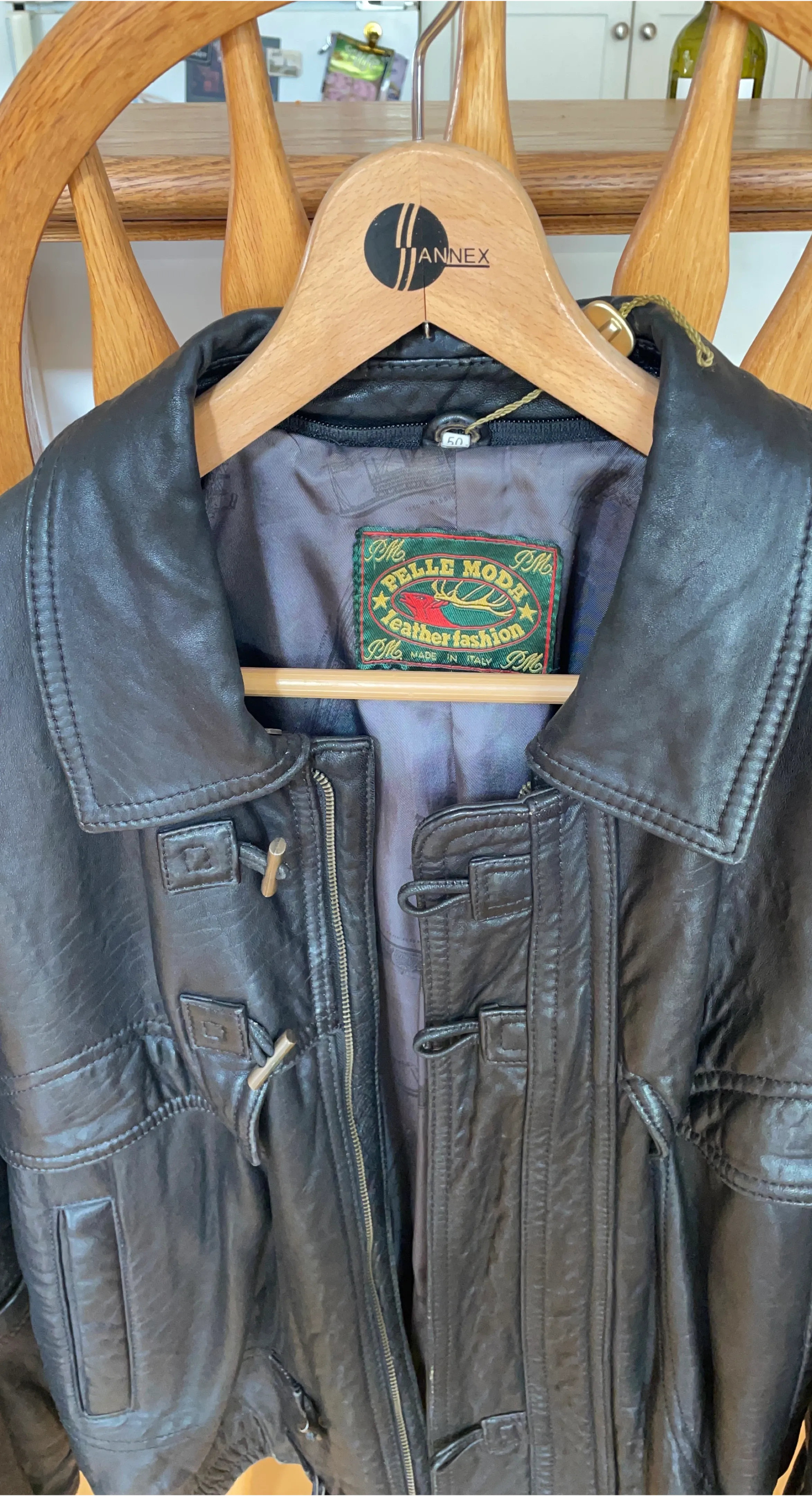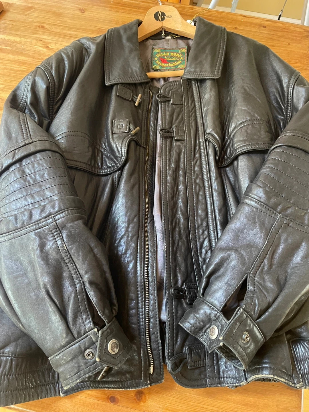A Pelle Moda leather jacket made in Italy. Classic design with a zippered front and toggle closures. It's a stylish outerwear piece. This jacket is made of leather material.