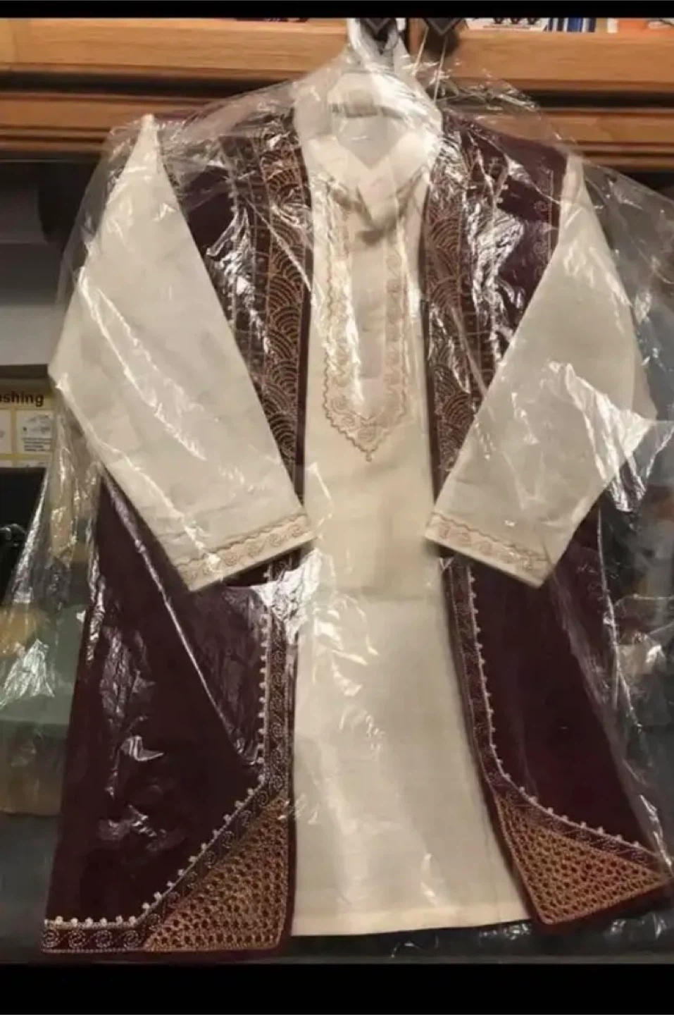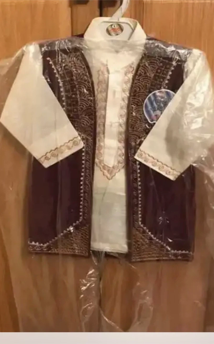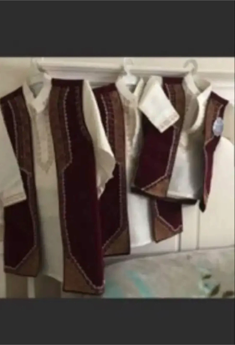 A set of traditional outfits for children. Includes a white kameez with intricate gold embroidery and a maroon embroidered waistcoat. Perfect for special occasions!