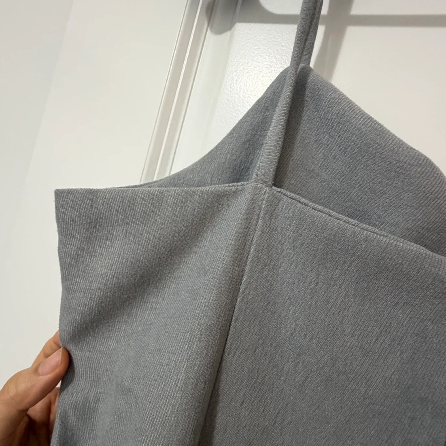 Clean and elegant grey midi dress with thin straps and a flattering silhouette.