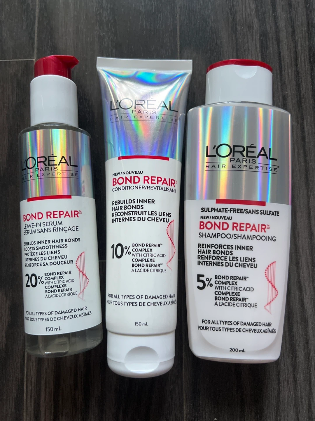 L'Oréal Paris Hair Expertise Bond Repair line. Includes leave-in serum (150 mL), conditioner (150 mL), and sulphate-free shampoo (200 mL). All formulated with Bond Repair complex and citric acid for damaged hair.