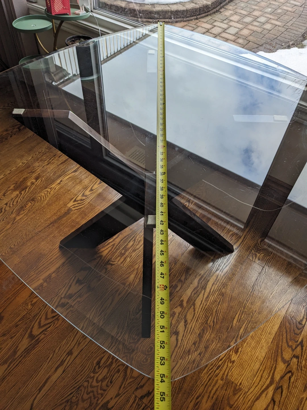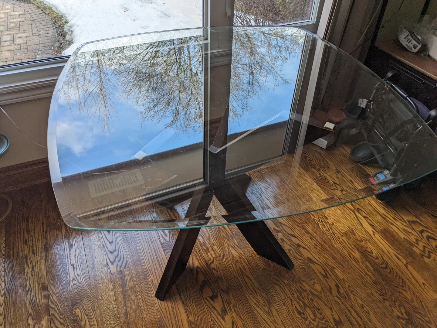 Glass top dining table with a unique X-shaped dark wood base. Table measures in the photos. It's a stylish addition to any dining space!