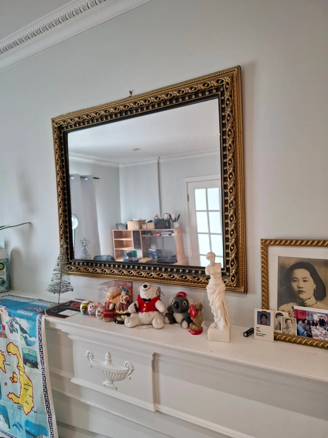 This is a decorative wall mirror with a detailed gold-coloured ornate frame. It has a classic look and would make a nice addition to any room. The mirror surface is clear and reflects well.
