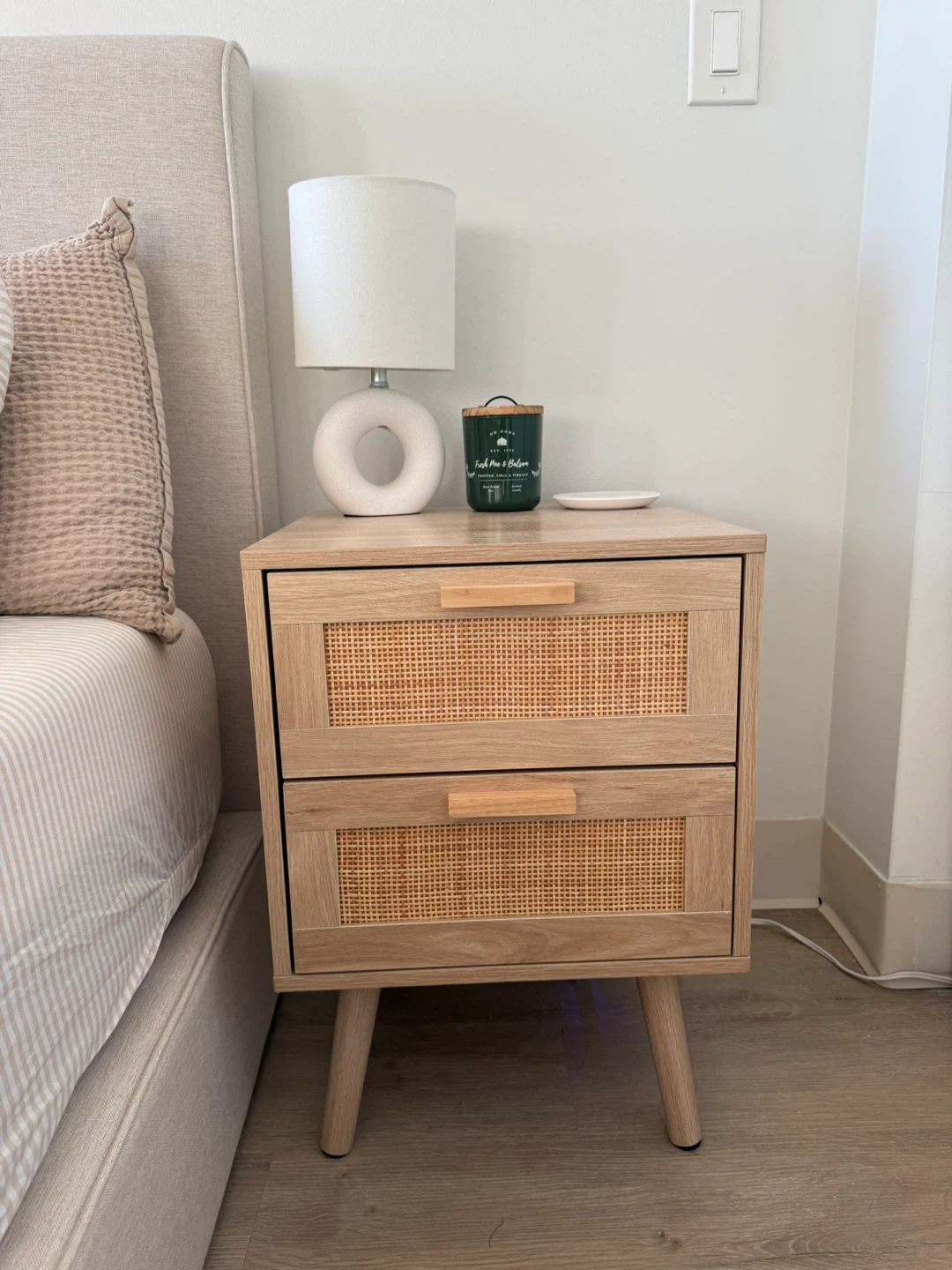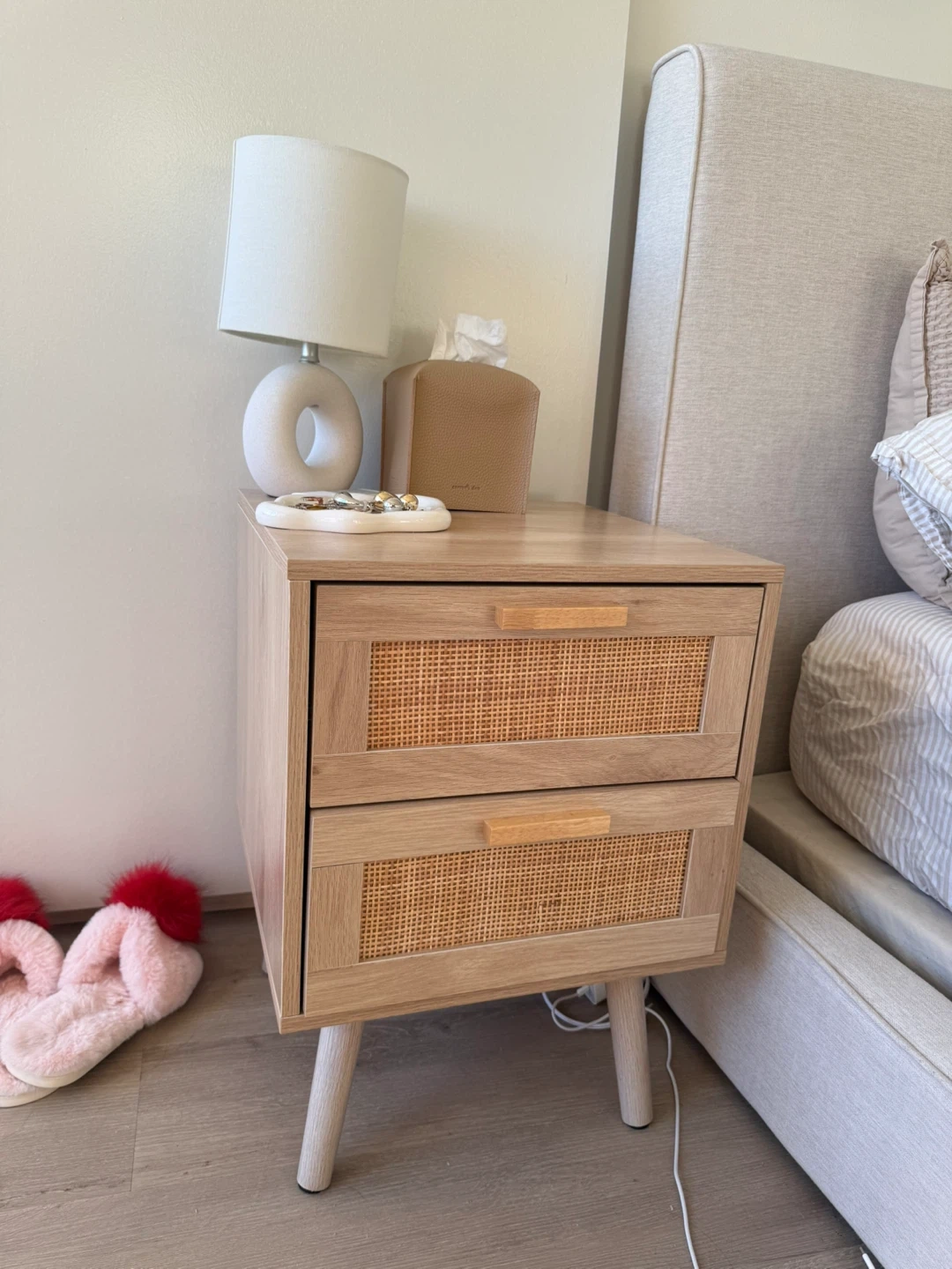 This nightstand features a light oak finish and rattan woven drawer fronts. It has two drawers with wooden handles. A great addition to a bedroom for storage!