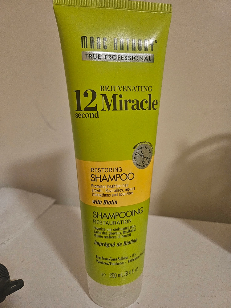 Selling a bottle of Marc Anthony True Professional Rejuvenating 12 Second Miracle Restoring Shampoo! It promotes healthier hair growth, revitalizes, repairs, strengthens, and nourishes with Biotin. It's also free from sulfates, parabens, and phthalates.