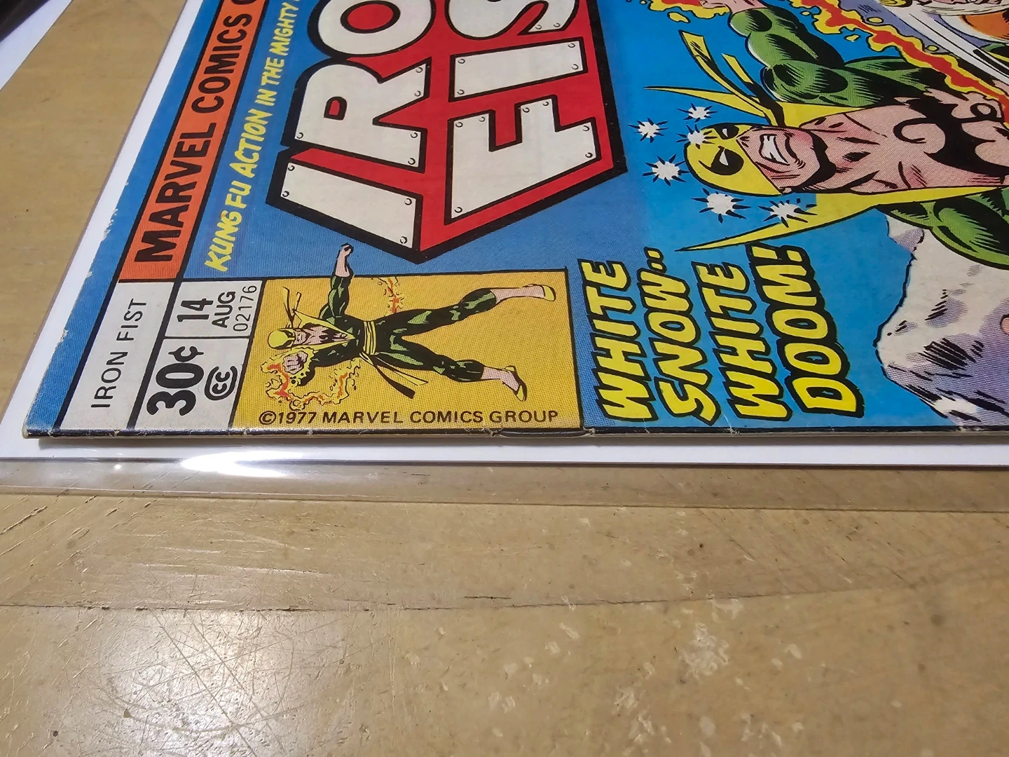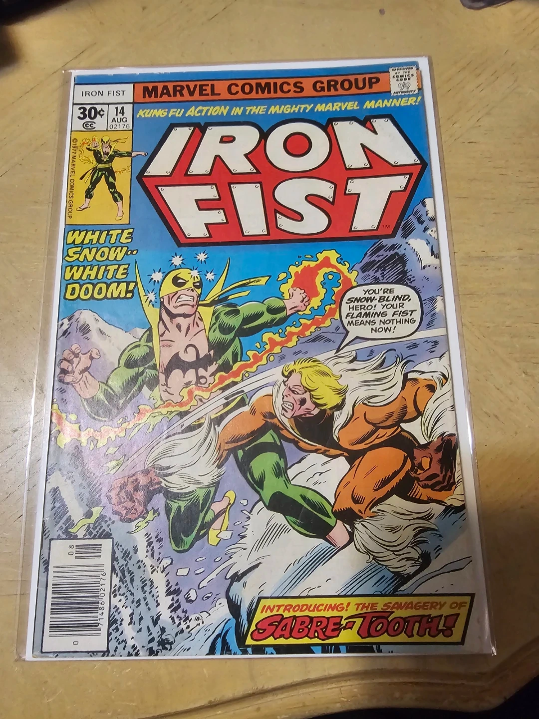 You are looking at a used copy of Marvel Comics Iron Fist #14 from August 1977, featuring the introduction of Sabretooth. This comic book is in fair condition, showing wear and tear typical of its age, as shown in the photos. A great addition to any comic collection.