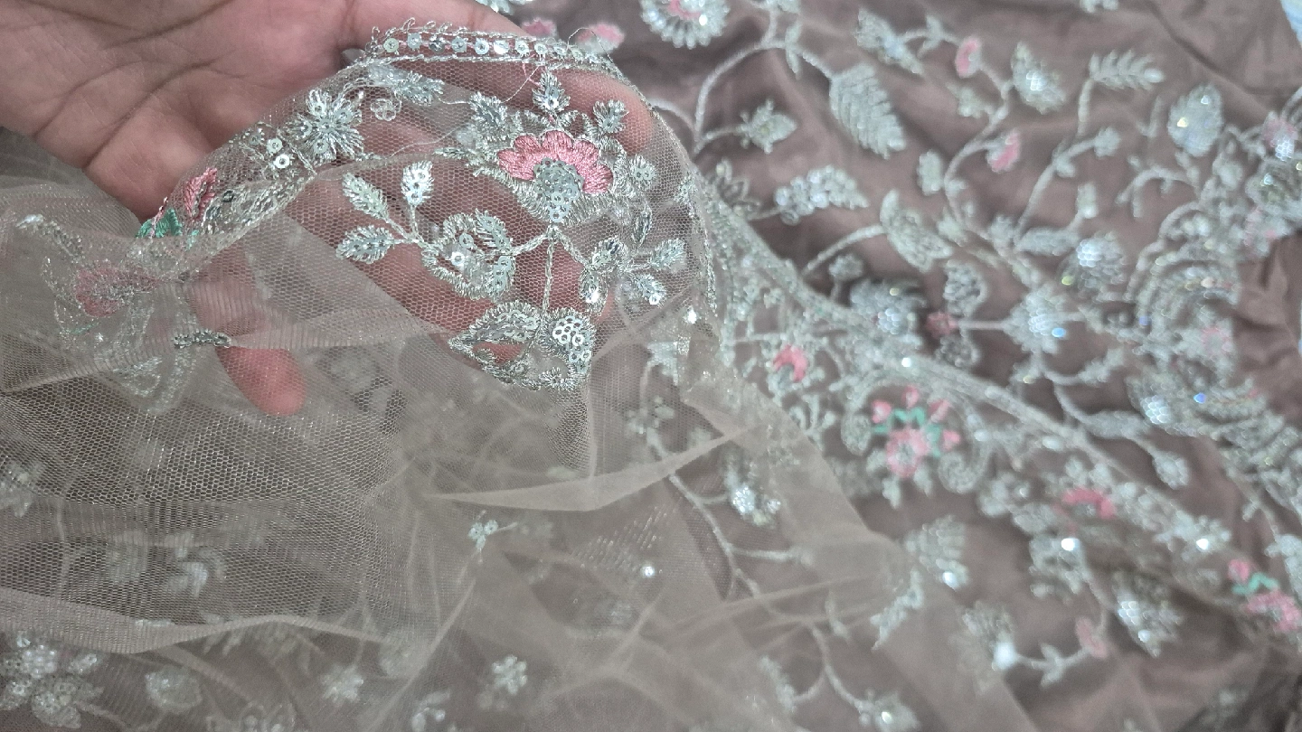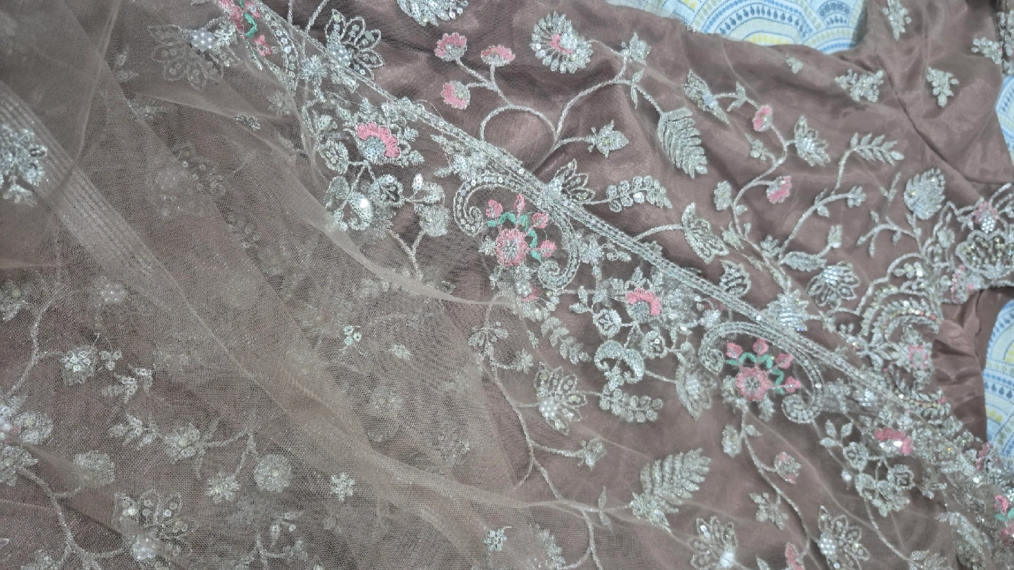Selling a beautiful salwar kameez suit with intricate embroidery. The fabric has a lovely sheen and the embroidery features delicate floral patterns with pink and silver accents. Perfect for a special occasion!