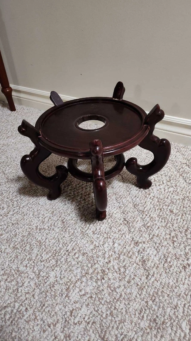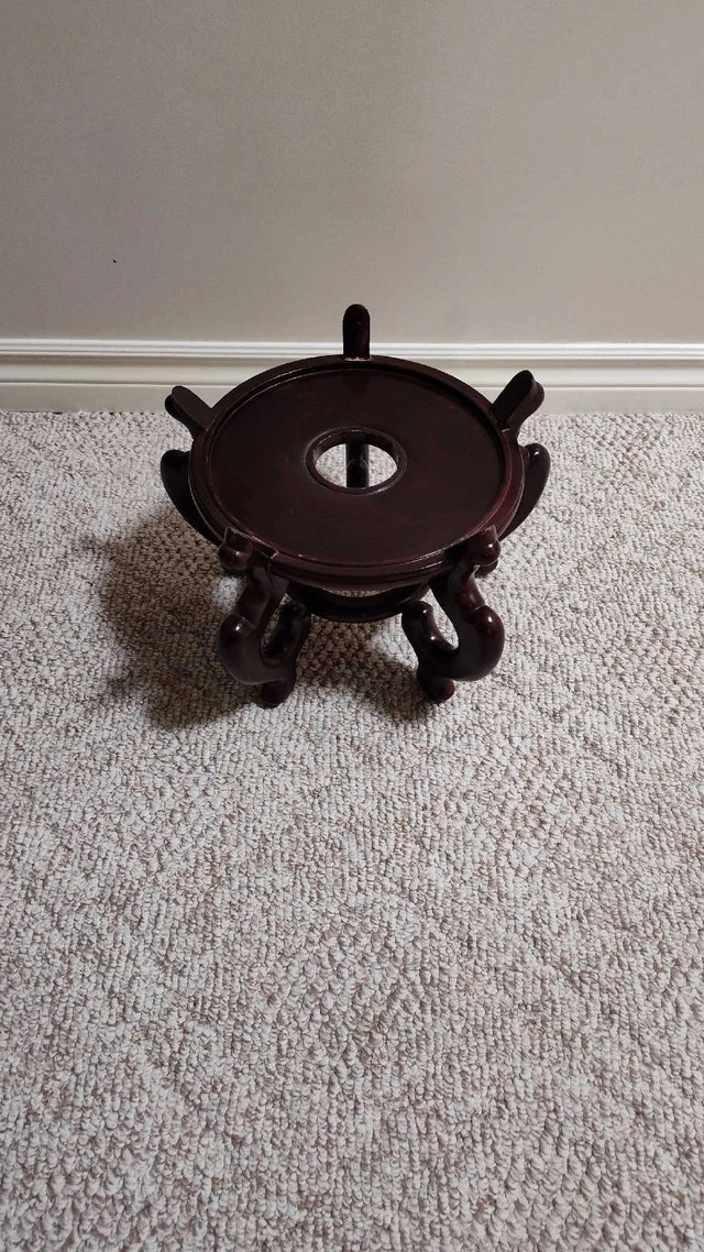 Add a touch of elegance to your home with this charming, used wooden plant stand, perfect for displaying your favourite potted plants! It features a decorative, dark wood finish and a sturdy, 5-legged design. Pick up in the Lisgar area of Mississauga. Round top, dark wood finish, 5-leg design. Condition: Used - Good. Cash accepted.