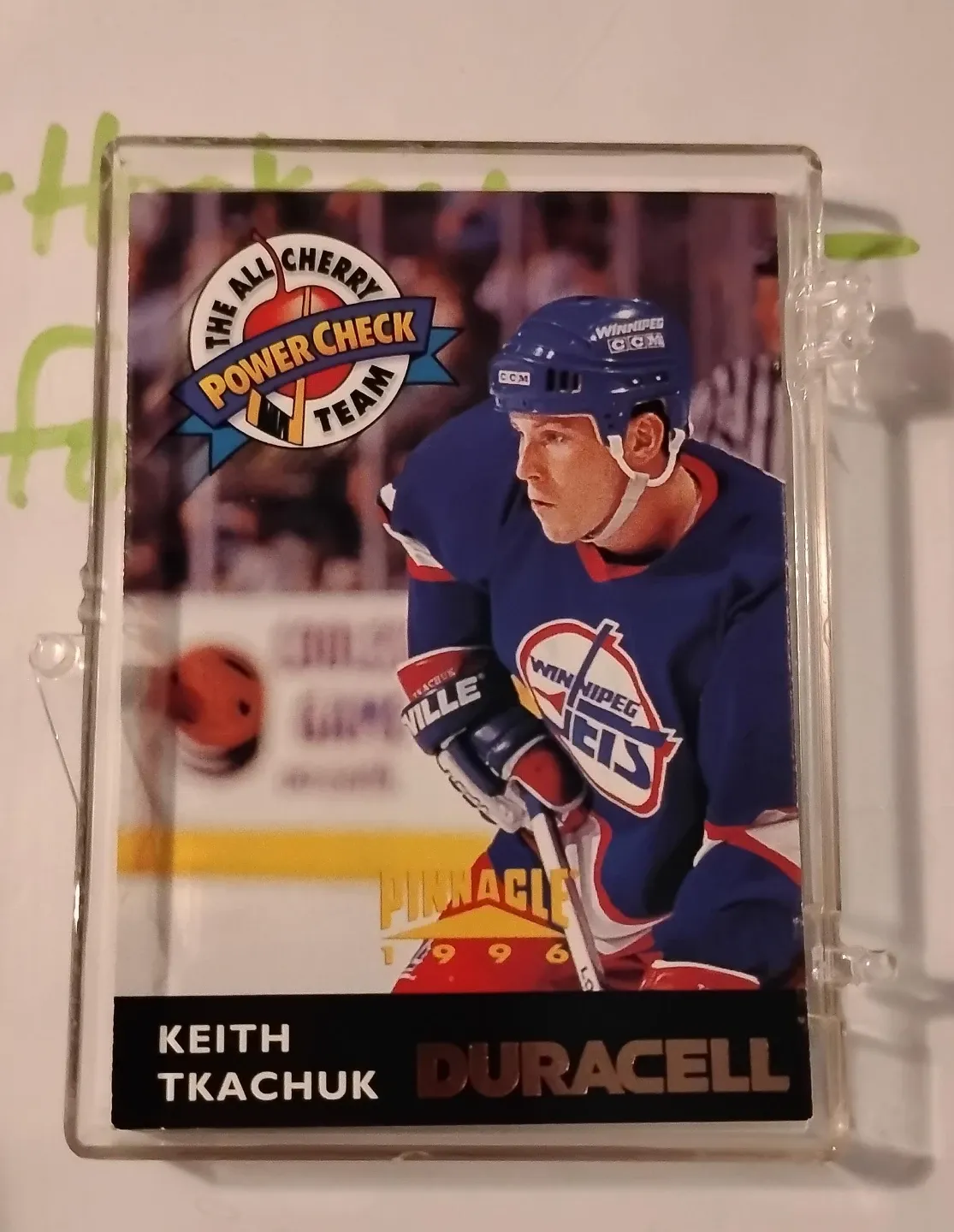 This is a 1996 Pinnacle hockey card featuring Keith Tkachuk of the Winnipeg Jets. The card is in a protective sleeve and includes the 'Power Check Team' graphic. It's a collectible for hockey fans!