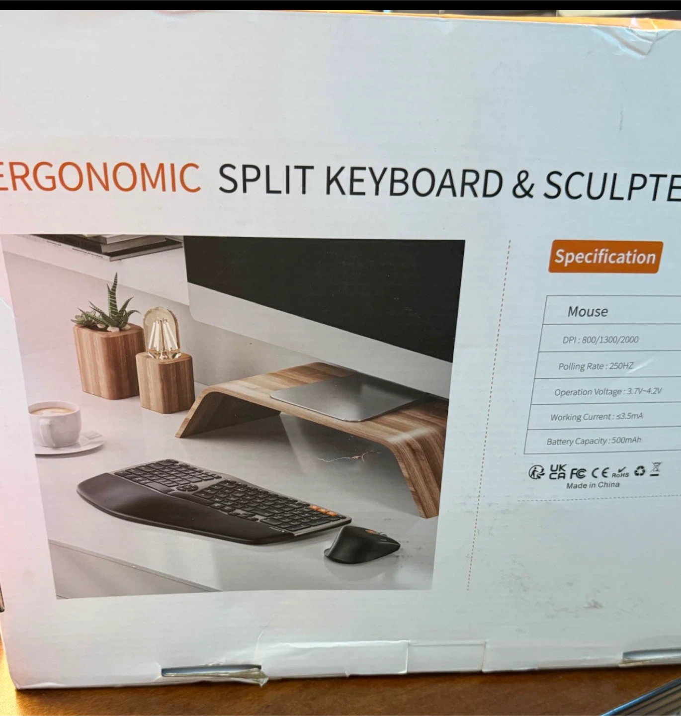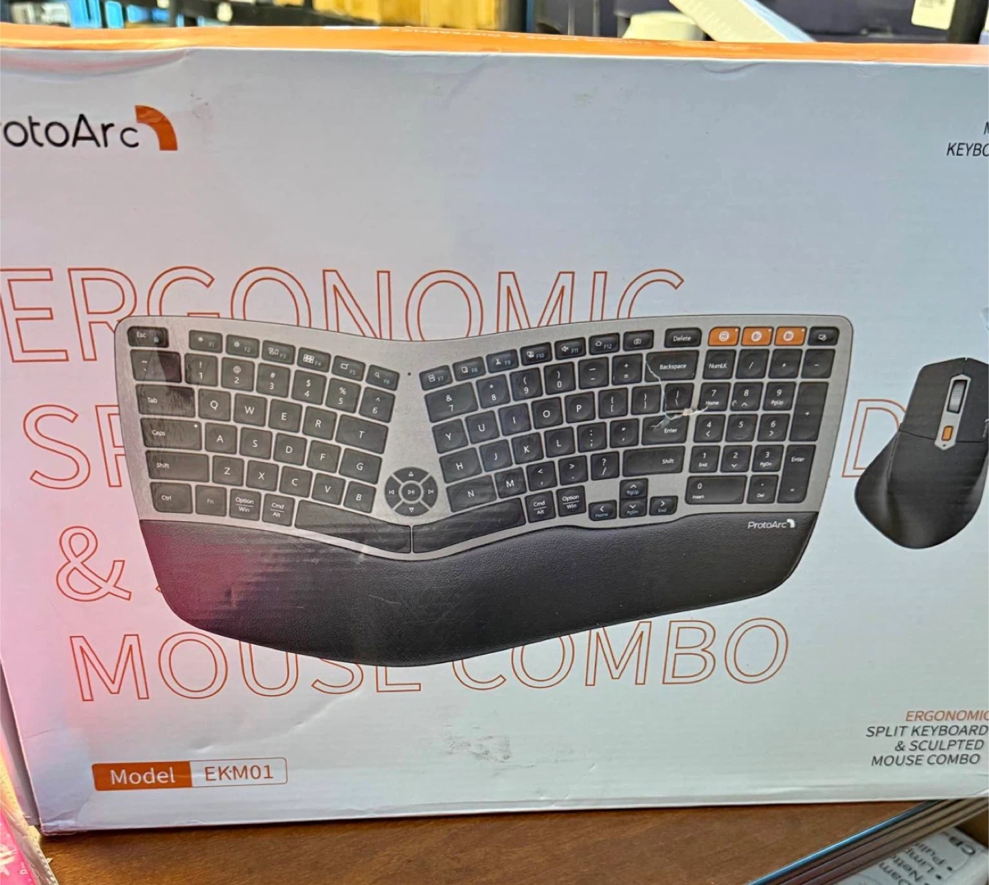 This is a ProtoArc EKM01 ergonomic split keyboard and sculpted mouse combo. It's designed for comfortable typing with a split layout. The mouse has a polling rate of 250Hz and operates between 3.7V-4.2V.