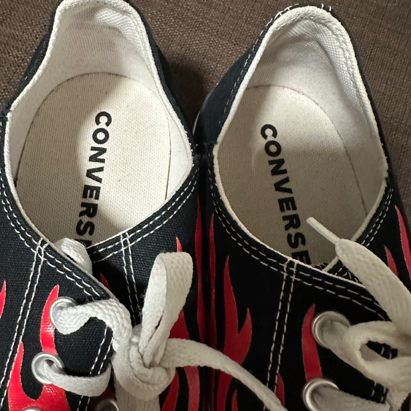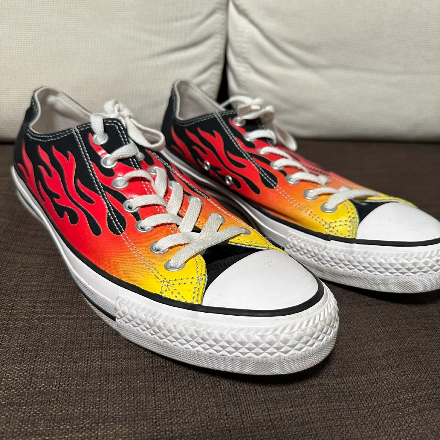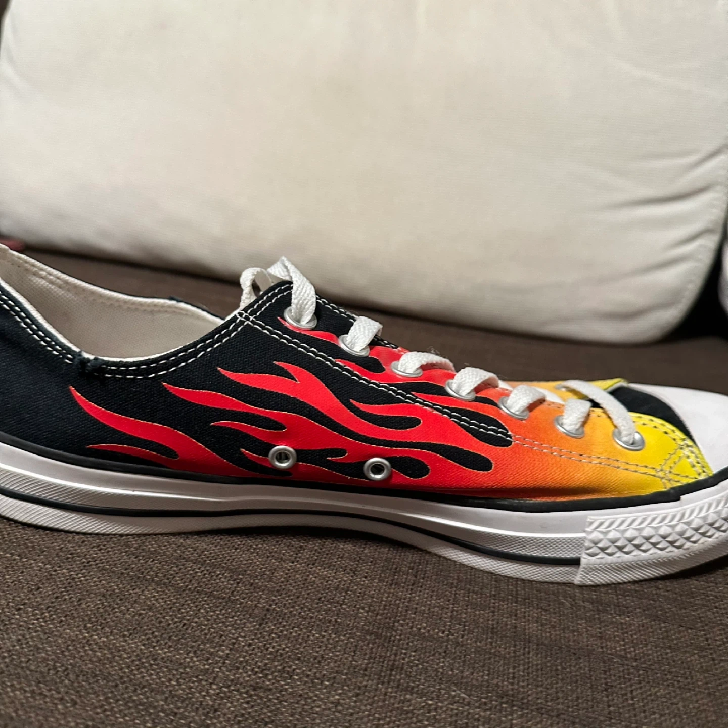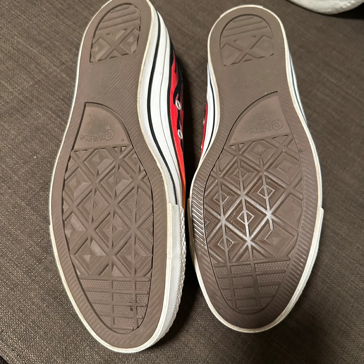 Cool Converse All Star sneakers with a flame design! These are in brand new, never worn and ready for a new home. They're perfect for adding a bit of fire to your step. Men’s Sz 11