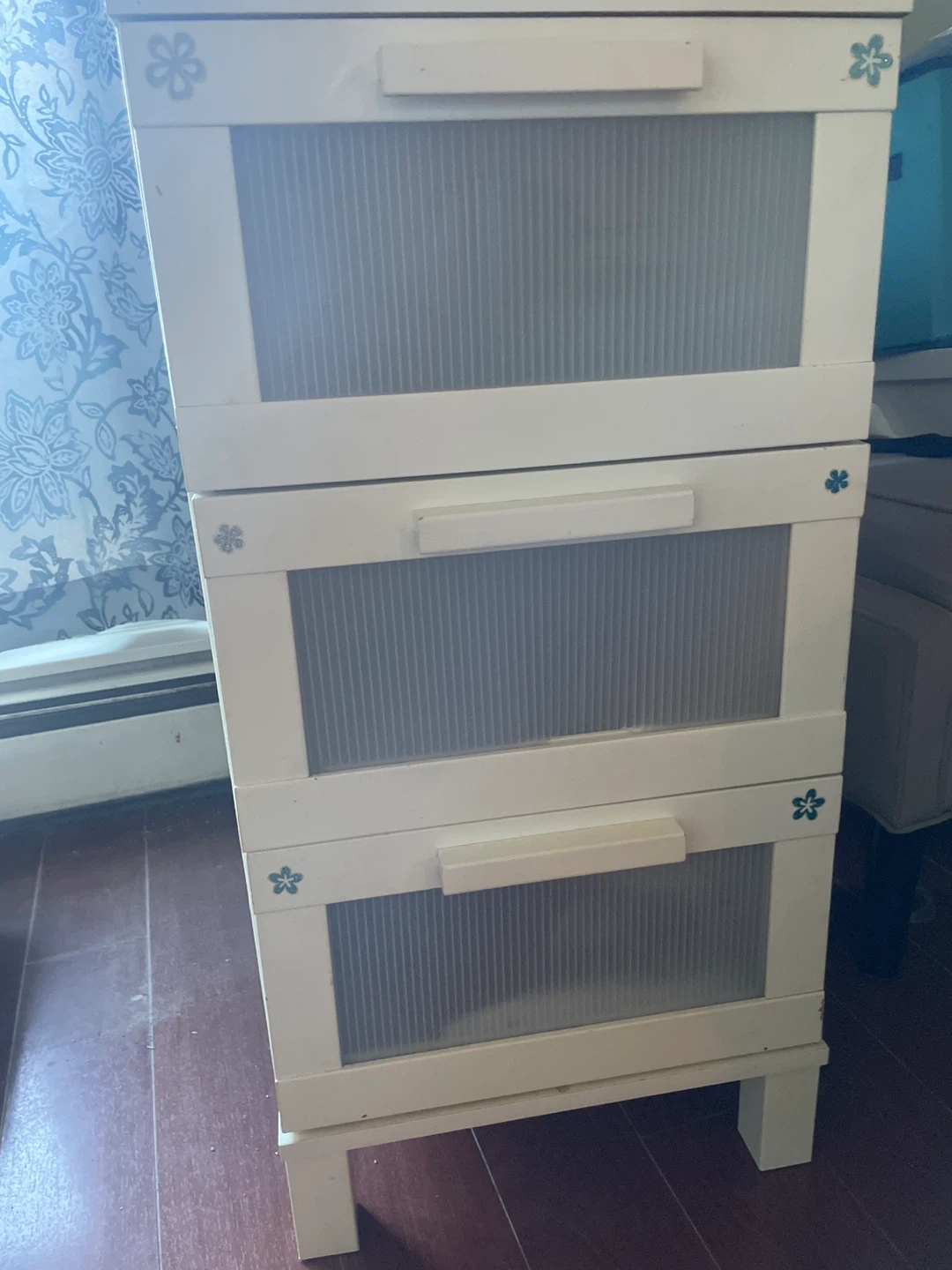 This is a 3-drawer storage unit. It's white and features small blue flower decorations on each drawer. Great for organizing small items! some flaws reflected in price
